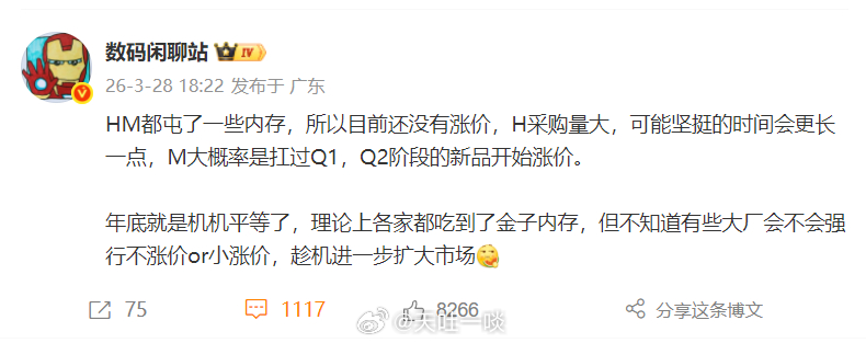 原来是小米提前囤了一些存储,行业人士表示肯定能扛过第一季度。过了第一季度、第二季度发布的新机会涨价。注意:这里说的是新机会涨价,没提老机型的事。也就是讲小米的老机型估计还会坚挺很长时间。
