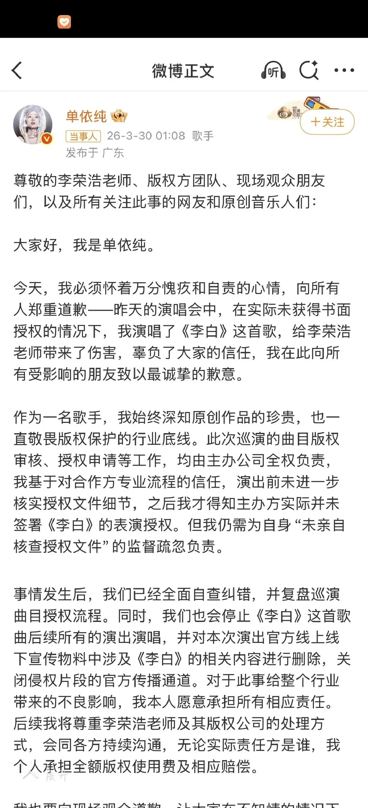 这波回应看完,更让人无语了! 单依纯关于《李白》侵权的回应,满纸都是“我以为”,把锅全甩给信任合作方,自己像个完全不知情的小白。 可作为专业歌手,版权是底线中的底线,这是入行就该刻在脑子里的规矩啊。 之前能唱不代表这次就可以,授权不是“以为”来的,是要实打实拿到手的。 现在一句“我错了”就想翻篇,还说以后再也不唱这歌,早干嘛去了? 真要负责任,不是嘴上说说承担赔偿就行,得从根子上重视版权问题。 歌手靠作品吃饭,更得守好版权的门,不然消耗的不仅是自己的口碑,更是观众对你的信任。 你们觉得单依纯这回应是真心认错,还是无奈公关?评论区唠唠你的看法!