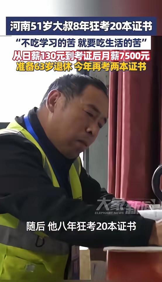 43 岁初中学历混工地,51 岁狂拿 20 本证逆袭本科!杭州大叔:我要学到 63 岁才退休! “如果不吃学习的苦,就要吃生活的苦。”这句话我们听过无数遍,却往往只当作一句轻飘飘的鸡汤。直到看见浙江杭州这位 51 岁的大叔,你才会明白,什么叫作“用命在拼搏”,什么叫作“人生任何时候起步都不晚”。 在这个普遍焦虑、动辄谈论"35 岁危机”的时代,苏先生用整整 8 年的血汗史,给所有想要躺平的人上了一堂最震撼的课。从一名只有初中学历、日薪 130 元的底层力工,到如今手握 20 本职业资格证书、拥有本科学历、从事轻松体面安全巡检工作的“技术大拿”,他的逆袭之路,简直就是一部现实版的《当幸福来敲门》。 故事要回溯到 8 年前。那时的苏先生 43 岁,正值中年,却不得不背井离乡,从河南老家来到繁华的杭州讨生活。没有高文凭,没有硬技能,他只能一头扎进建筑工地,干着最苦、最累、最危险的体力活。那是怎样的一种日子?每天天不亮就要起床,顶着烈日或寒风,搬运重物、搅拌水泥,浑身沾满泥浆。即使拼尽全力起早贪黑,一天的收入也仅仅只有 130 元。 那微薄的薪水,扣除房租伙食,所剩无几。每当夜深人静,拖着像灌了铅一样的双腿回到简陋的出租屋时,苏先生看着自己满是老茧的双手,心里五味杂陈。他深刻地体会到了“没文化、没技术”带来的切肤之痛:不仅身体被透支,尊严被挤压,更可怕的是看不到未来的希望。那种无力感,像一块巨石压在他的心头。 也就是在那一刻,苏先生心里憋了一股劲:“难道我这一辈子就只能这样了吗?”他不甘心。既然生活给了他一手烂牌,他就要靠学习把它打成王炸。 改变,是从那一盏昏黄的台灯下开始的。白天在工地累得直不起腰,晚上回到出租屋,别人都在刷视频、打牌消遣,苏先生却掏出了书本。对于一个离开校园多年的中年人来说,重新捡起课本绝非易事。那些枯燥的专业术语、复杂的电路图,起初看得他头晕眼花。但他咬紧牙关,一遍不懂看两遍,两遍不懂查资料,硬是靠着这股“笨功夫”,在无数个挑灯夜战的夜晚,啃下了第一块硬骨头。 当他终于拿到第一本“建筑电工证”时,命运的天平开始倾斜。凭借这本证书,他很快找到了一份月薪 7500 元、还包吃包住的工作。相比之前的 130 元日薪,这不仅是收入的翻倍,更是身份的转折。尝到了知识甜头的苏先生,仿佛打开了新世界的大门,学习的劲头一发不可收拾。 此后的 8 年,成了苏先生“开挂”的 8 年。他像个不知疲倦的战士,见缝插针地学习。工间休息时,他在背题;下班路上,他在听课;节假日里,他在备考。整整 8 年,他疯狂考取了 20 本各类职业资格证书!从电工到安全员,从施工员到建造师,每一本证书背后,都是无数个日夜的汗水与坚持。 不仅如此,他还做出了一个让周围人都震惊的决定:提升学历。一个年过半百的大叔,重新坐回课堂,从初中起点一路狂奔,攻读土木工程专业。今年六七月份,当他顺利拿到本科毕业证书时,所有的艰辛都化作了嘴角自信的微笑。 如今的苏先生,早已告别了搬砖提灰的苦力生涯。51 岁的他,担任工地安全巡检员。工作内容不再是出卖体力,而是凭借专业知识进行技术把关。每天只需跑两三个工地,每次检查不过三四个小时,工作轻松、环境体面,受人尊敬。这种巨大的反差,正是知识赋予他的底气。 但苏先生的脚步并未停止。面对众人的赞叹,他只是平淡地说:“我计划学到 63 岁再退休。”今年,他已经又考下了两本证书,并打算年内再攻下两本。在他眼里,年龄从来不是阻碍,停止学习才是。 苏先生的故事在网络曝光后,瞬间引爆了舆论。网友们纷纷留言:“这才是真正的活到老学到老!”“吾辈楷模,看完羞愧得想立刻去读书。”“原来 43 岁真的不算晚,怕的是你连开始的勇气都没有。” 确实,苏先生用行动证明了一个朴素的真理:人生没有太晚的开始,只有过早的放弃。生活的苦,吃得再多也只是消耗;而学习的苦,吃得越多,回报越厚。在这个瞬息万变的时代,唯一能掌控命运的,就是不断增值的自己。 如果你此刻正处在迷茫中,或者觉得为时已晚,不妨想想杭州这位苏大叔。只要心中有光,脚下有路,哪怕是从泥潭中起步,也能一步步走上云端。别让年龄定义你的人生,别让现状困住你的梦想。从今天起,拿起书本,为了那个更好的自己,拼一次!60岁读大学 农民工考证