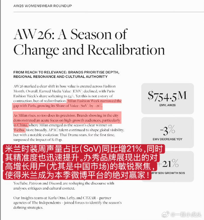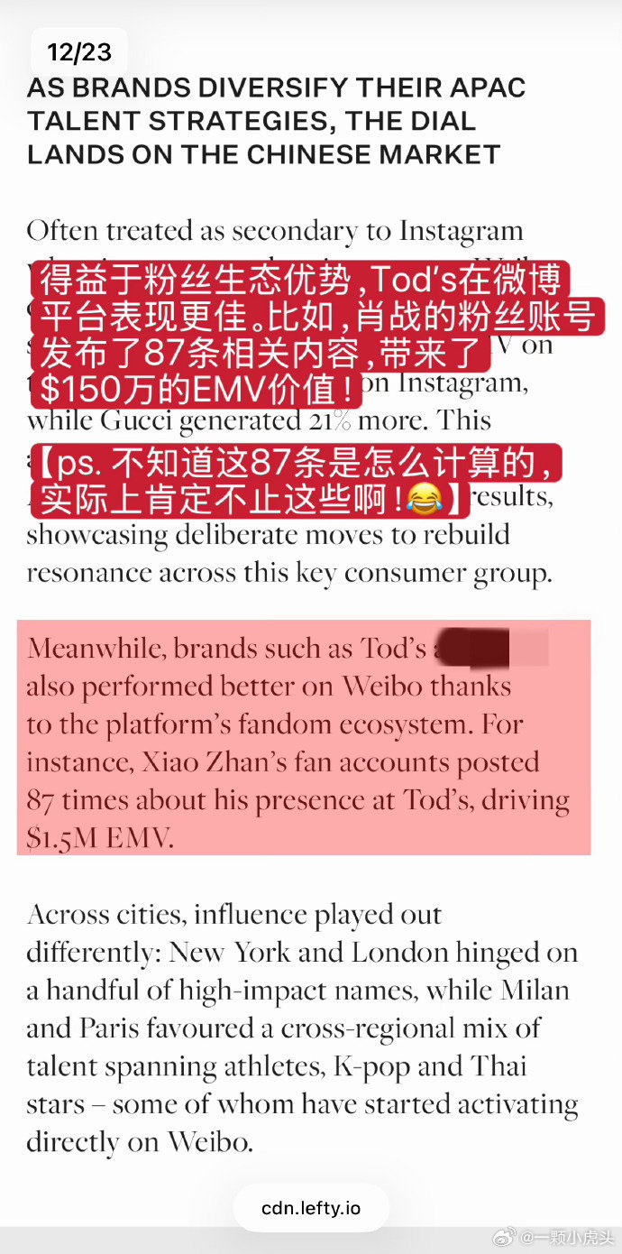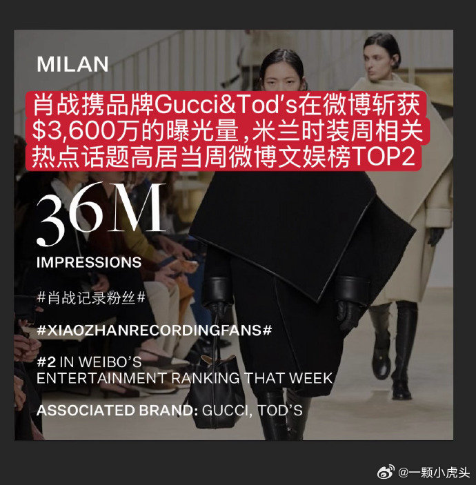 AW26米兰时装周肖战数据炸场!肖战以断层1240万美元EMV登顶微博顶级博主榜首,成为中国区时装周绝对流量核心。Gucci凭他实现127%同比暴涨,稳坐全球EMV TOP3;Tod's借他跻身中国社媒第一梯队,单靠粉丝互动撬动150万美元EMV。他一人带动米兰时装周3600万美元微博曝光,用“肖战效应”让两大代言品牌实现海内外声量双爆发,用顶级影响力诠释奢侈品中国市场的流量密码,是当之无愧的全球时尚标杆!