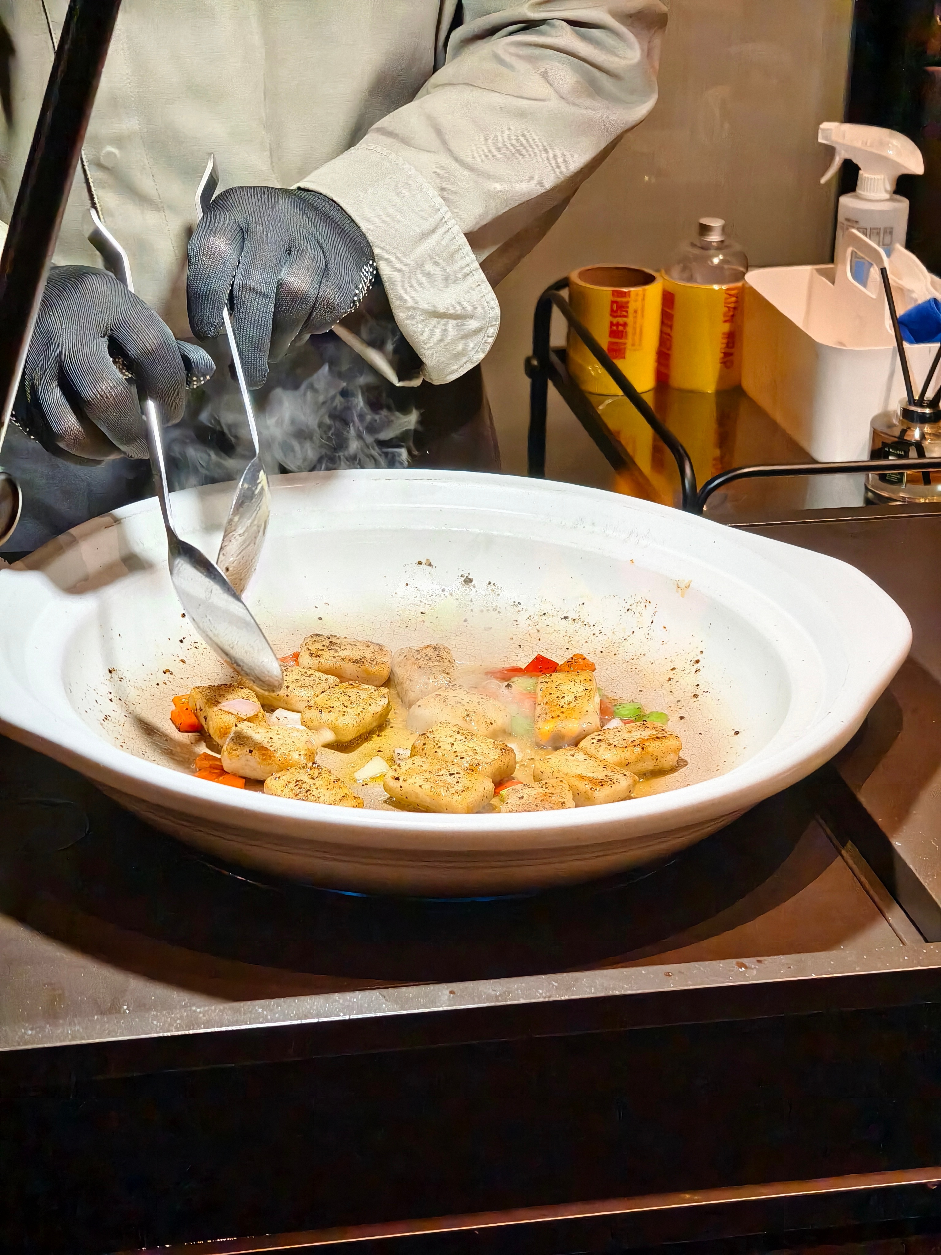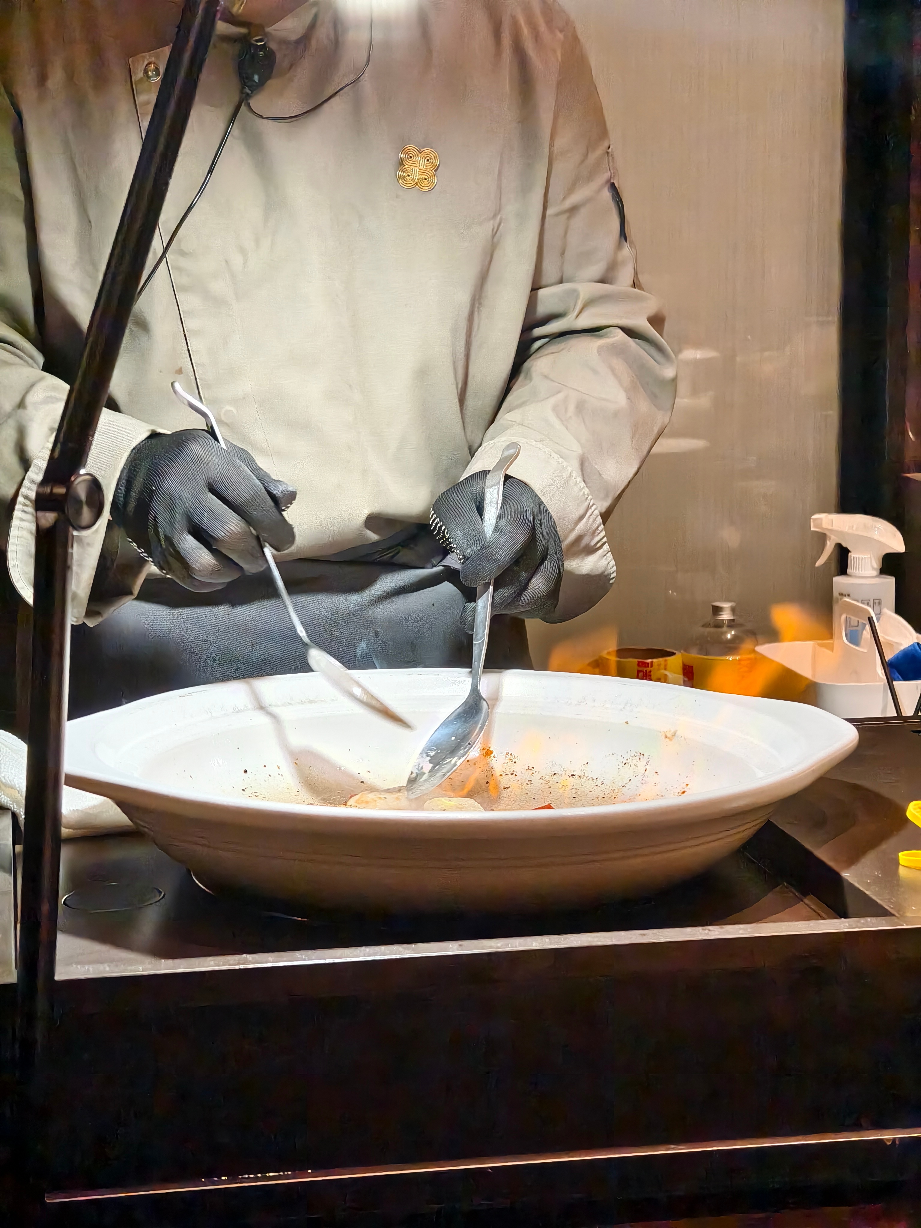 这道菜,还真有点东西,厨师直接现场制作,还加了点茅子,燃起来了。有股淡淡的酒香,