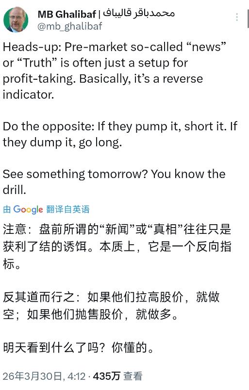 伊朗议会议长卡利巴夫今天(北京时间3月30日)写道:“注意:盘前所谓的‘消息’或‘真相’往往只是为获利回吐做铺垫。实际上,这是一种反向指标。反其道而行之:如果他们造势炒作,就做空;如果他们抛售,就做多。明天要是有新的消息?你们懂的。” 核心逻辑很简单,这些信息的发布者早就攥着筹码,就等情绪被点燃后收割。所谓反向指标,本质是看穿了“信息-情绪-交易”的操纵链条,不是单纯对着干,而是摸清了资金运作的底牌。 市场里的消息从来都分三六九等,真正有价值的信息永远不会在盘前广而告之。那些突然刷屏的利好或利空,大多是经过筛选和包装的产物。发布时机往往选在交易流动性最低的时段,比如亚洲盘尾、欧美盘前的空窗期,这时候少量资金就能撬动价格波动,制造出符合预期的走势。更关键的是,这些消息会通过不同渠道分层释放,先让少数大资金提前布局,等普通投资者看到时,已经成了接盘或割肉的信号。 这种操纵能奏效,根源在于信息不对称和人性弱点的叠加。大多数普通投资者习惯依赖公开消息做决策,却不知道这些信息早已被机构拆解利用。行为金融学里的损失厌恶心理,让人们面对上涨时害怕错过而追高,面对下跌时恐慌割肉,正好掉进预设的陷阱。而社交媒体的放大效应,会让这种情绪快速扩散,形成羊群效应,进一步推高或压低价格,让操纵者顺利完成获利回吐。 反向操作的核心不是盲目逆势,而是看清资金的真实意图。当市场被刻意造势炒作时,往往意味着操纵者已经建好多头仓位,就等散户跟风后反手做空;当出现集中抛售潮时,可能是机构在清洗浮筹,准备低价吸筹。这种手法在波动剧烈的市场里更常见,比如受制裁影响的伊朗金融市场,外汇短缺、通胀高企,资金更容易通过消息操纵获利,这也是卡利巴夫会特别提醒的原因。 机构操纵市场的套路一直在升级,从早期的虚假宣传到现在的技术化操作。有的通过高频交易挂出虚假买卖单,诱导市场跟风后瞬间撤单,也就是所谓的“幌骗”手法;有的则利用跨境监管盲区,在不同市场间转移资金,规避监管打击。更值得注意的是,这些操纵往往不会被重罚,罚款金额对机构来说只是九牛一毛,难以形成真正的威慑,这也让市场操纵屡禁不止。 理解反向指标,本质是学会区分情绪和价值。市场短期涨跌往往由资金和情绪主导,而这些被炒作的消息,大多与资产的真实价值无关。普通投资者之所以容易被收割,就是因为把短期消息当成了长期价值的判断依据,忽视了底层的基本面。卡利巴夫的提醒,其实是在建议跳出情绪陷阱,关注资金流向和筹码变化,而不是被表面消息牵着走。 在全球化的金融市场里,这种消息操纵早已不是个例。从大宗商品到股市汇市,总有资金在利用信息差获利。尤其是在信息传播更快的今天,消息的生命周期越来越短,操纵的节奏也越来越快。对普通投资者来说,与其追逐瞬息万变的消息,不如培养独立判断的能力,看清消息背后的资金逻辑,这才是反向指标真正的价值所在。市场从来都不缺机会,缺的是看透操纵本质的眼光,那些能在消息纷飞中保持理性的人,才能真正避开陷阱,找到属于自己的机会。