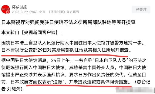 日本有进一步动作了!3月29日,根据国内媒体报道,尽管日本至今没有任何道歉,仅对我们表示遗憾,但是日本警视厅对强闯我驻日使馆一事仍在进行调查。日前,日本警察厅已经对该不法之徒所属部队驻地等展开搜查。很显然,日本警方就是要通过进一步的取证,给该事件做出一个定性。 这场调查的定性走向,直接牵着中日关系的神经。要说是普通个人极端案件,未免太过牵强。一个现役自卫队军官,刚从干部候补生学校毕业,正是接受体系化教育后的阶段,却做出如此突破外交底线的行为。日本自卫队的教育环境早有端倪,防卫大学的教材里还在用“支那事变”“大东亚战争”这类充满侵略色彩的词汇,把侵略历史歪曲成“自卫”,甚至频繁邀请右翼人士讲课,学员还要去靖国神社“朝圣”。这种长期的认知毒化,很难说只是个别现象。 但如果定性为自卫队思想极端化非个案,对高市早苗政府来说又是两难。她上台后的一系列操作本就充满右倾色彩,之前公然发表涉台错误言论,鼓吹“台湾地位未定论”,暗示要行使集体自卫权,已经让中日关系降到冰点。现在要是承认自卫队内部出了系统性问题,不仅会引发国际社会对日本军事力量走向的警惕,国内的抗议声浪也会更大。之前已有上千名日本民众连续集会,高喊“高市道歉”,要求妥善处理事件,这种民间压力让政府不敢轻易触碰敏感结论。 所谓的转圜空间,本质上是高市政府是否愿意放下政治投机。她一边要向美国表忠心,炒作“邻国威胁论”,一边又扛不住对华关系恶化带来的实际损失。今年中国发展高层论坛上,日本大企业集体缺席,连中小企业都没露面,80多家外企里唯独日本企业“零出席”,这背后是中方明确的态度信号。中方已经更新了出口管制清单,40家日本军工企业上榜,还对日本卤化丁基橡胶加征反倾销税,一季度日本对华出口的化工品、机械类产品都出现明显下滑,这些实打实的经济影响,让日本经团联都急着发公开信,要求政府重新评估对华政策。 高市政府不是没意识到问题,只是左右摇摆。她既想通过强硬姿态巩固右翼基本盘,又不想彻底失去中国市场。丰田社长早就说过“失去中国市场等于失去未来”,这种业界的焦虑的是真实存在的。现在的搜查行动,更像是在给自己留退路,通过取证过程拖延时间,观察中方反应,也试探国内舆论走向。如果后续能拿出有诚意的处理结果,比如正式道歉、严肃追责,甚至借此调整自卫队的教育和管理,中日关系确实有缓和的可能。 但转圜空间不代表中方会妥协。使馆是国家领土的延伸,保障外交机构安全是《维也纳外交关系公约》规定的义务,日本没有任何理由推诿责任。之前中方已经多次就高市的涉台言论提出严正交涉,暂停相关合作、发布安全提醒,这些动作都表明了底线。现在的关键要看日本是否真的愿意纠正错误,而不是继续用“遗憾”敷衍,或者把事件轻描淡写为个人行为。 自卫队与靖国神社的深度绑定也值得警惕,前自卫队将领出任靖国神社宫司,幕僚长参与决策,集体参拜屡禁不止。这种把军国主义幽灵当“英灵”供奉的做法,只会不断滋生极端思想。村田晃大的行为,更像是这种体系化灌输结出的恶果,和上世纪日本军部少壮派的偏激行径有着惊人的相似之处。如果日本不能正视历史教育的问题,就算这次事件暂时平息,未来还可能出现类似的风险。 中日关系的转圜,从来不是一方单方面让步,而是需要双方都拿出诚意。高市早苗政府如果真的想改善关系,就该借着这次调查,彻底查清事件根源,严肃追究相关人员责任,停止在涉台等核心利益问题上的挑衅。同时,正视国内右翼势力的蔓延,清理自卫队内部的错误思潮,这才是打破僵局的关键。 现在的搜查只是第一步,后续的处理结果才是真正的试金石。如果只是以“非法侵入建筑物”轻罪结案,继续回避核心问题,转圜空间只会越来越小。但如果能借此机会展现负责任的态度,回应中日两国人民的和平期待,那么受损的双边关系还有修复的可能。毕竟,无论是政治互信还是经贸合作,对抗从来都没有赢家,只有正视问题、尊重彼此核心利益,才能让中日关系回到健康发展的轨道。