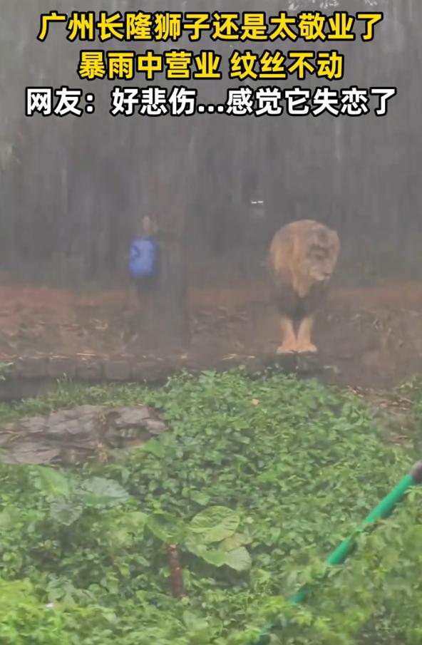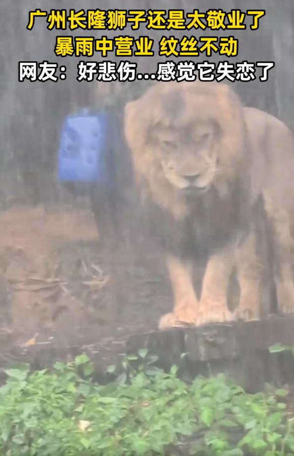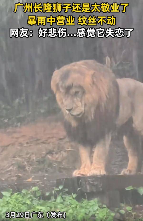 太敬业了!广东广州,女子冒着大雨去长隆玩,期间就看到狮子站在暴雨下面一动不动,那感觉就好像失恋了一样,让人又心疼,又好笑。网友:可能是母狮子有新欢了 视频中,当时暴雨如注,长隆野生动物世界的狮子山上,一头雄狮就那么安静地站在台阶高处,低着头,一动不动。任大雨劈头盖脸浇下来,它的鬃毛湿透了贴在身上,它也没挪一步 旁边游客撑着伞,雨衣裹得严严实实,镜头对准它,又好笑又有点心疼。拍摄的女子说,这狮子站那儿的模样,像极了失恋,不是那种愤怒的失恋,是那种沉默的、发呆的、连雨都懒得躲的失恋 视频配上伤感的BGM,在网上一下就火了 有人说,要是下场雨就让它动摇,那还当什么森林之王。这话说得硬气,也确实有道理。狮子在野外本就经历风雨,这点雨对它来说,可能还真算不上什么。它没躲,不是躲不了,是没必要 也有人说,这狮子够敬业,暴雨天还坚持“上班”。但说实话,狮子哪懂什么敬业,它只是在过自己的日子。雨水淋着不舒服,但它选择站着,也许因为那是它常待的位置,也许就是单纯不想动。动物很多时候比人干脆,累了就趴,想站就站,没那么多内心戏 反而是冒雨去逛长隆的人,是真敬业。大雨天还往动物园跑,这份心气和好奇,其实比狮子更值得说一嘴。人为了看动物,可以淋成落汤鸡;动物在雨里站着,人又替它心酸。这中间那点微妙的共情,才是这件事最好玩的地方 人总喜欢往动物身上投射情绪。狮子低着头,就觉得它难过;狮子一个人待着,就觉得它孤独。可它可能只是在放空,或者说,在狮子那套体系里,站雨里和站太阳底下,没太大区别 我倒是觉得,这头狮子无意间做了一件事:它在暴雨里一动不动,反而让人记住了它。在这个大家都忙着躲雨、躲麻烦、躲不舒服的世界里,一个不躲的姿势,就显得特别。