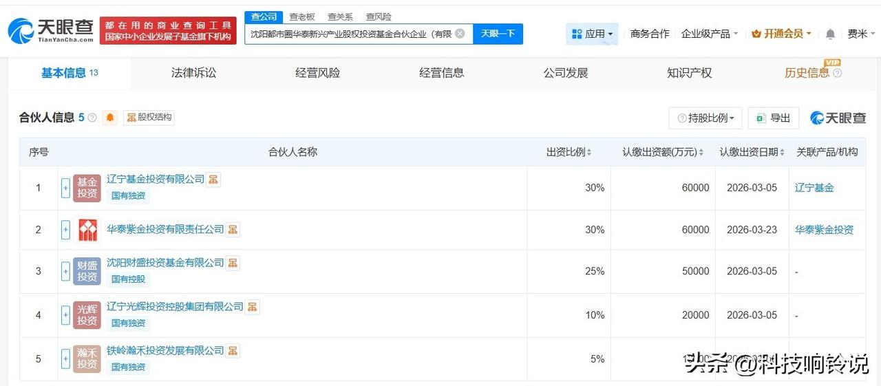 【华泰证券等在沈阳成立新兴产业股权投资基金 出资额20亿】 天眼查App显示,近日,沈阳都市圈华泰新兴产业股权投资基金合伙企业(有限合伙)成立,执行事务合伙人为华泰紫金投资有限责任公司,出资额20亿人民币,经营范围为以私募基金从事股权投资、投资管理、资产管理等活动。合伙人信息显示,该基金由辽宁基金投资有限公司、华泰证券(601688)旗下华泰紫金投资有限责任公司、沈阳财盛投资基金有限公司等共同出资。 天眼查信息: