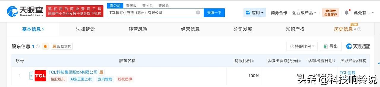 【TCL成立国际供应链公司 注册资本500万】 天眼查工商信息显示,近日,TCL国际供应链(惠州)有限公司成立,法定代表人为黄晖,注册资本500万人民币,经营范围包括报关业务、国际货物运输代理、供应链管理服务、货物进出口、道路货物运输等。股东信息显示,该公司由TCL科技(000100)全资持股。 天眼查信息: