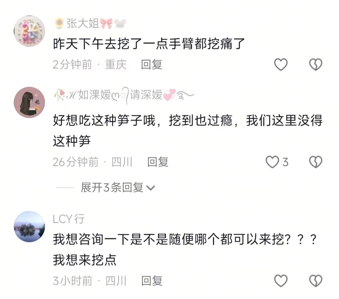 现在全网最糟心的男人就是徐三娃了吧! 不是因为挖不到春笋,也不是因为没人买他的笋, 而是因为挖笋挖到天黑累到崩溃,还被网友拿甘二娃挖笋坐牢的事儿追着调侃!真服了 刷到徐三娃挖春笋的视频,本来是冲着山野烟火气点进去的,结果越看越有代入感,到最后愣是被评论区的留言整笑了又整慌了,说实话,这日常看着热闹,实则藏着不少门道。 老实讲,视频里的徐三娃本来就打算去后山随便挖点春笋,想着笋子刚冒头,挖个十来斤够吃就行,谁知道一进山直接看呆了,笋子跟约好了似的可劲儿窜,半米高的、连体双胞胎的,遍地都是,本来想浅挖一下就撤,结果越挖越起劲,根本停不下来。 然后刚挖完一批歇口气,朋友微信就来了,要100斤剥好皮的笋,行吧,麻溜称重剥壳搞掂,给人送过去还请了菠萝啤,本来以为这就杀割了,结果又一个朋友打电话要150斤,我晕,剩下的笋压根不够,只能扛着锄头再进山,一挖就挖到天黑,整个人累到崩溃,我隔着屏幕都替他腰酸。 本来以为最有意思的是挖笋的热闹,结果点开评论区,我和小伙伴都惊呆了。有人直接拿甘二娃乱挖别人笋被追责的事调侃,问他都出了这事儿了还敢随便挖?不是吧?真的假的?还有人追着问能不能随便进山挖,黄颠笋跟普通笋到底有啥区别,更有人直呼一块钱一斤也太便宜,深圳带皮都要十三块一斤,这差价直接给我看麻了。 坦白说,看完真的挺有感触的,别人常说万事都有边界,不属于自己的东西别乱碰,强求来的东西未必是福,这不就是现成的例子?本来好好的日常分享,要是没搞清楚山林权属,说不定就惹上大麻烦了。 总之,我想说的是,别看着山野里的东西新鲜就随便挖,先搞清楚能不能挖、是谁家的,不然一不小心就闯祸,得不偿失。还有啊,帮人忙也得量力而行,别为了面子把自己累到崩溃,佛系一点不好吗?