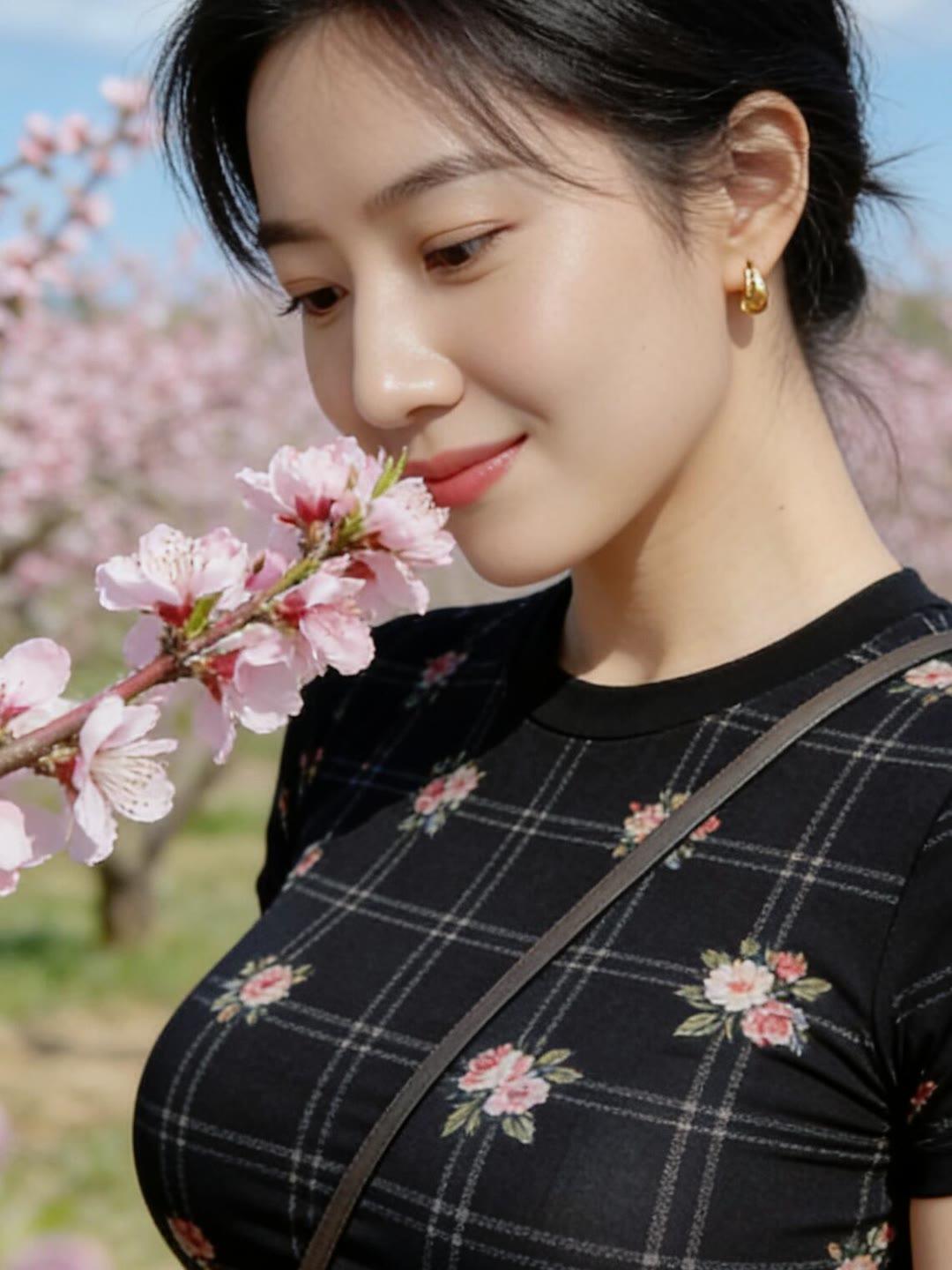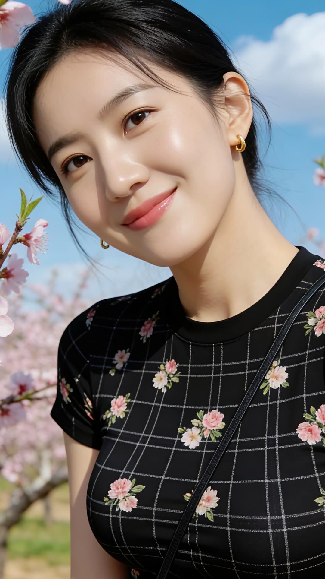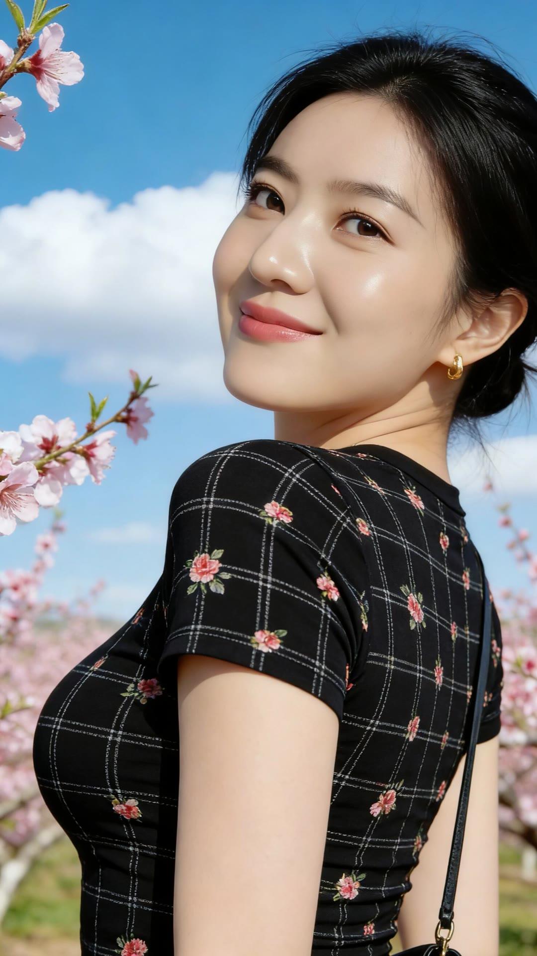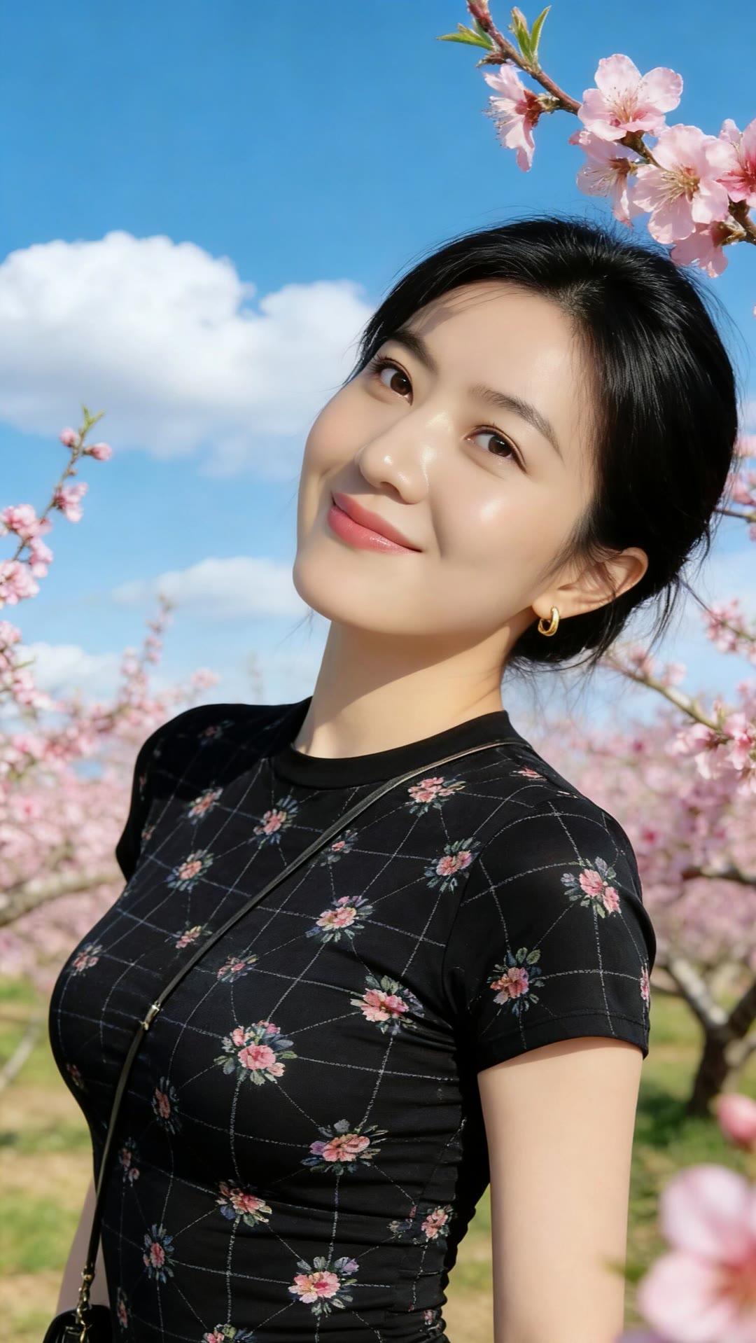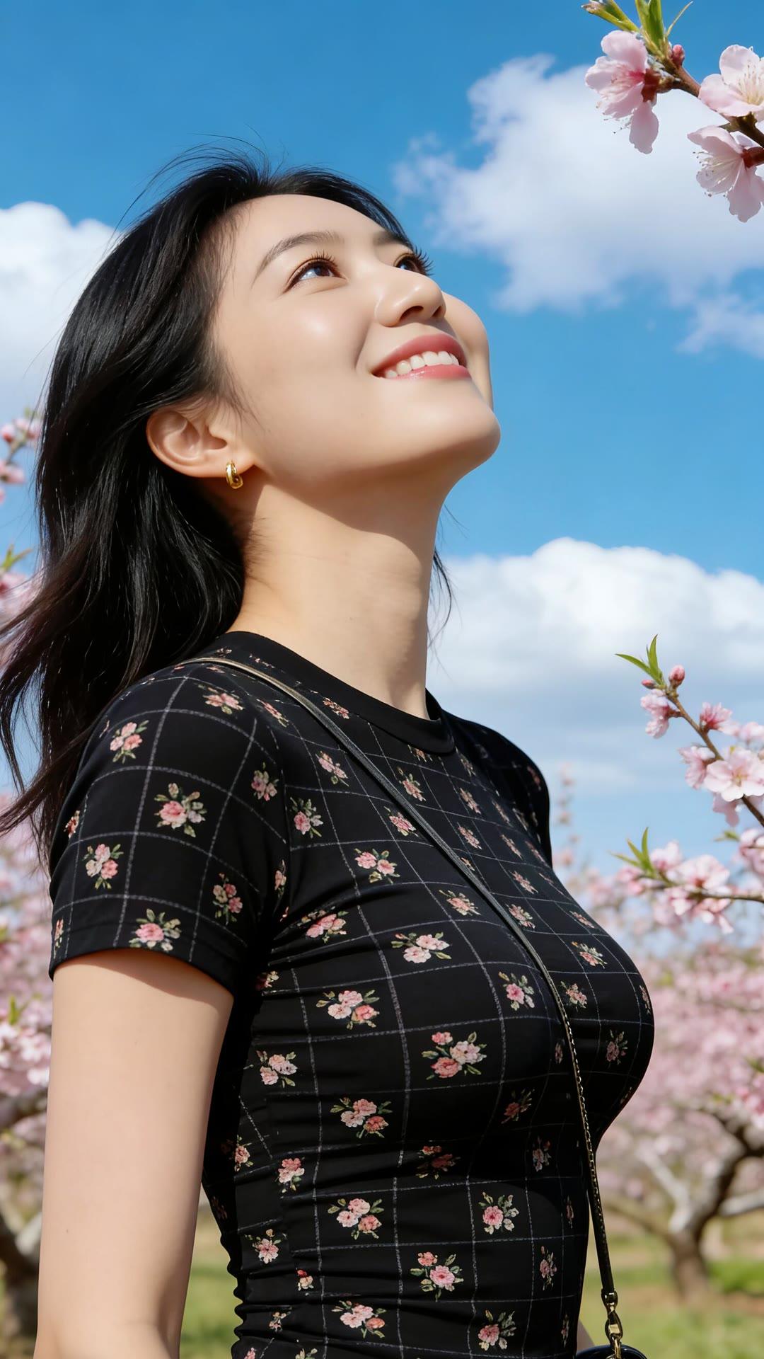 春日花海中的甜美少女,粉嫩樱花与黑裙相映成趣,笑靥如花。🌸💕