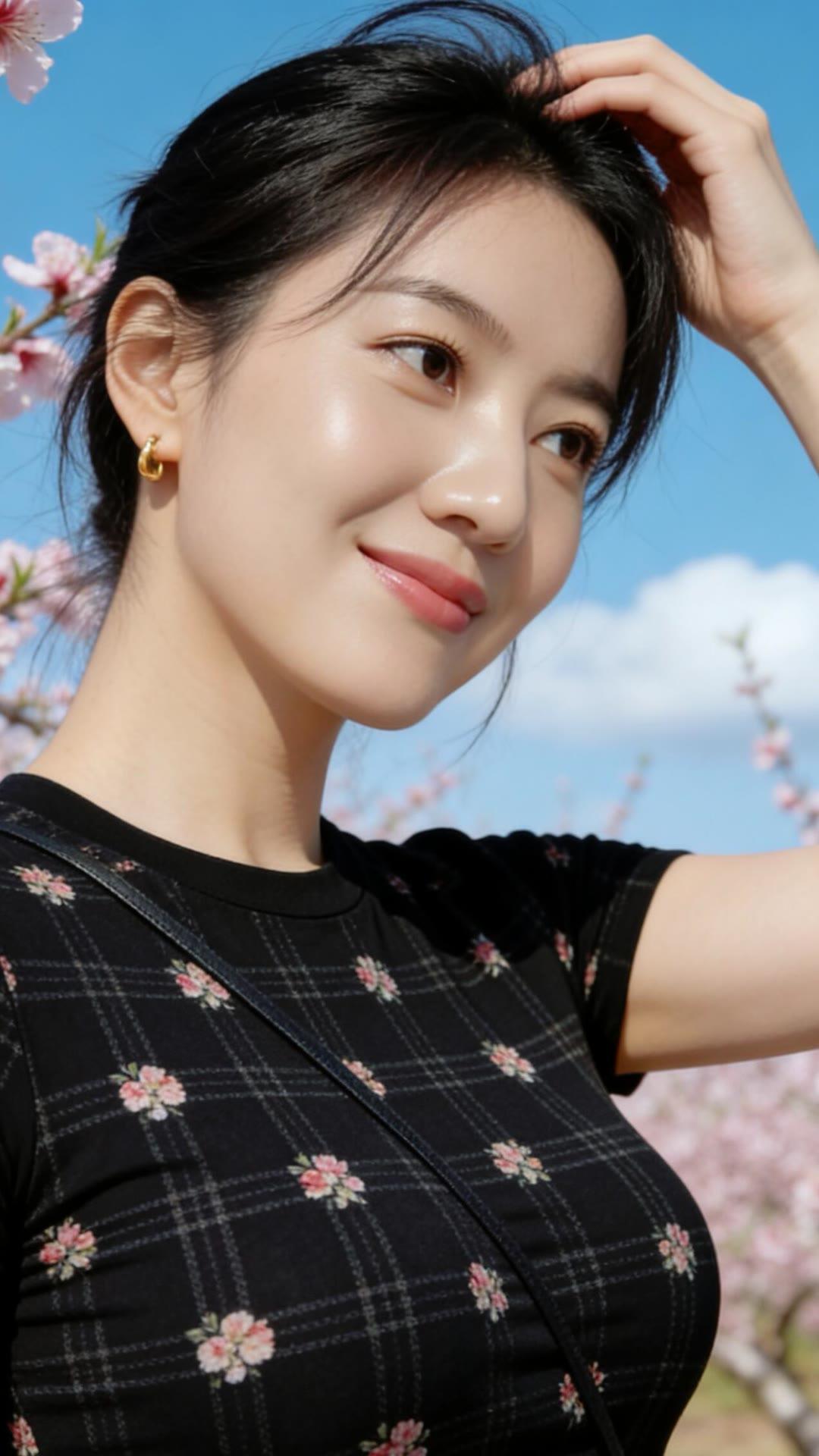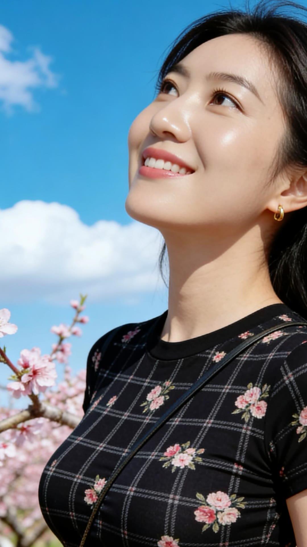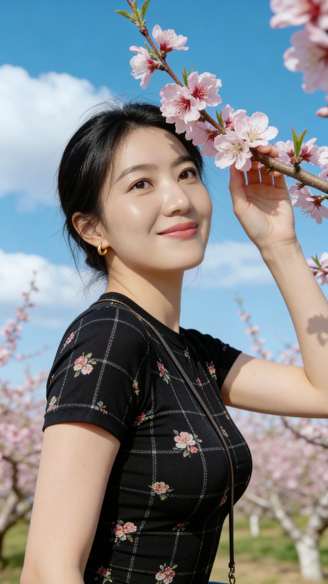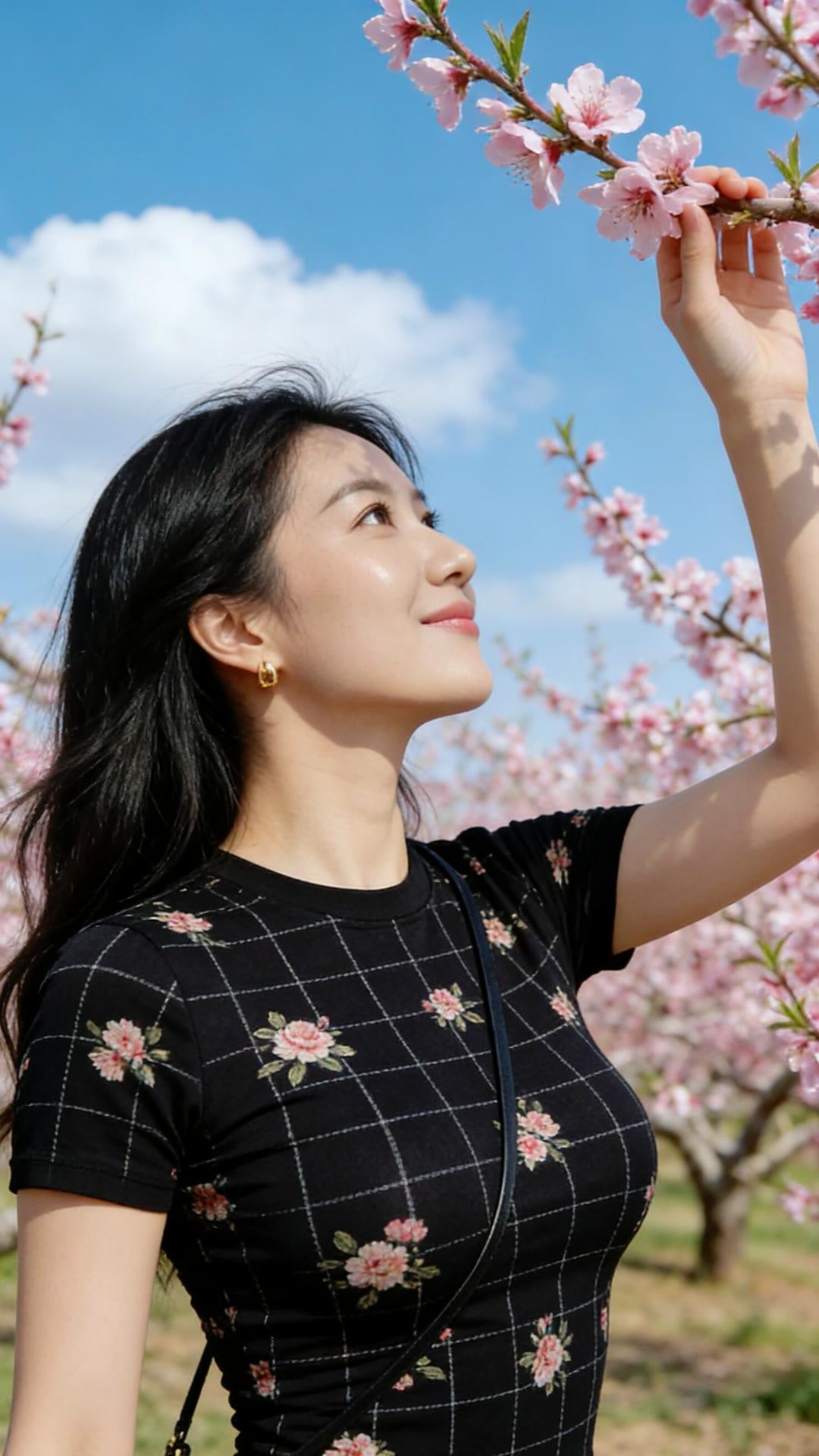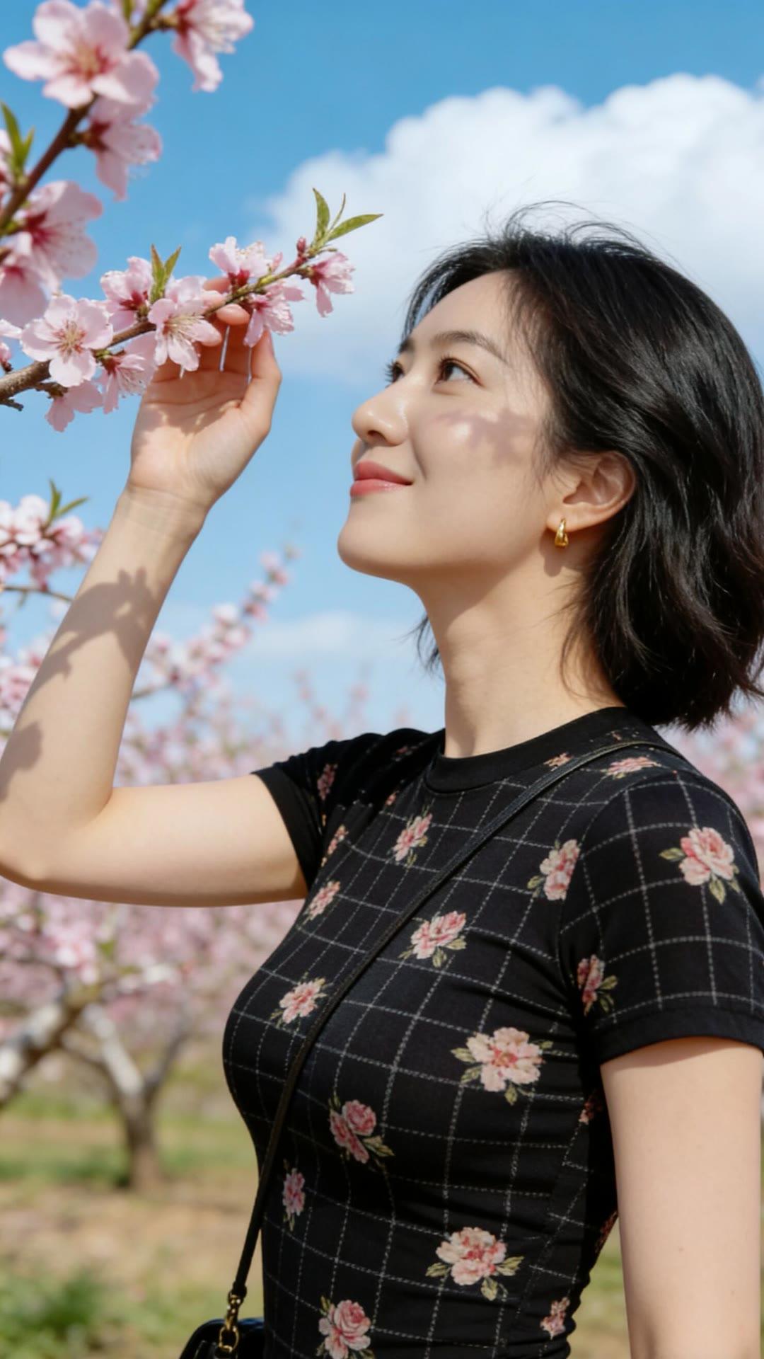 春日花海中的甜美少女,粉嫩樱花与黑裙相映成趣,笑靥如花。🌸💕
