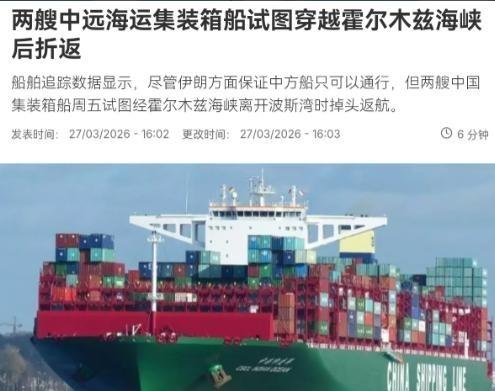 伊朗并没有兑现承诺,中国货船通过霍尔木兹海峡受阻!3月28日,根据法新社报道,中国远洋海运集团在3月25日发布的客户公告中表示,已恢复从亚洲开往阿联酋、沙特、巴林、卡塔尔、科威特和伊拉克的普通货物集装箱船的预订。而伊朗外交部长阿拉格齐也表示,伊朗“已允许包括中国、俄罗斯、印度、伊拉克和巴基斯坦在内的友好国家通过霍尔木兹海峡”。但是,事实上,结果并不是那么回事。 霍尔木兹海峡是波斯湾通往外界的唯一海上通道,全球五分之一的石油贸易和大量海运货物都要经过这里。中东局势动荡,美伊冲突升级后,伊朗开始加强对这条海峡的管控,全球航运公司都在密切关注动向,中国航运企业和从事中东外贸的商家也持续跟踪变化。 3月24日,中国外交部长应约与伊朗外长阿拉格齐通电话。阿拉格齐在电话中通报了霍尔木兹海峡的最新情况,明确表示海峡对所有人开放,船只可以安全通过,只有正在交战的国家除外。第二天,也就是3月25日,阿拉格齐在伊朗国家媒体的采访中,把这个说法讲得更具体,直接提到中国、俄罗斯、印度、巴基斯坦、伊拉克这些国家是伊朗的友好国家,相关船只可以安全通过霍尔木兹海峡。 同一天,中国远洋海运集团发布客户公告,表示恢复从亚洲开往阿联酋、沙特、巴林、卡塔尔、科威特和伊拉克的普通货物集装箱船预订。此前在3月4日,因为中东局势升级,海峡通行风险升高,该集团暂停了这些航线的新订舱业务。这次恢复订舱,加上伊朗外长的公开表态,让航运行业和外贸行业觉得局势有所好转,认为中国船只终于能正常使用这条航线,不用再承担高风险,也不用绕远路增加成本。 实际情况却没有按照预期发展。3月26日,伊朗伊斯兰革命卫队海军司令阿利雷扎·坦格西里在以色列针对班达尔阿巴斯的空袭中丧生。次日3月27日,革命卫队发布正式声明,宣布霍尔木兹海峡全面实施严格管控,任何往返美国、以色列及其盟友和支持者港口的船只一律禁止通行,任何擅自穿越的行为都会遭到严厉打击。 就在同一天,中国远洋海运旗下的两艘超大型集装箱船“中海印度洋”号和“中海北冰洋”号尝试从波斯湾驶出,靠近霍尔木兹海峡入口的拉拉克岛附近水域。根据船舶追踪平台的公开数据,这两艘船未能获得通行许可,只能掉头折返,回到之前的锚地,最终没有进入海峡。两艘船的船东是中国远洋海运,船员都是中国公民,航行前也标注了中国船东身份,完全符合伊朗外长提到的“友好国家船只”条件,但还是没能通过。 外交部发布的通行承诺与革命卫队的实际管控由不同部门负责,对外表态的承诺在执行层面没有约束力。革命卫队在海军司令遇袭后迅速升级了海峡管控禁令,之前外交部发布的友好国家通行安排被新禁令覆盖。船只要想通过海峡,需要提前提交船舶信息、货物清单、船员信息,拿到伊朗方面的通行代码,并按照指定航道行驶,这些要求在实际操作中增加了限制。 中国远洋海运恢复订舱,并不是让干线船直接穿越霍尔木兹海峡,而是采用新的运输方案。所有发往中东六国的货物,干线船只运到海峡外面的港口,然后通过保税陆桥运输,或者用支线船转运到最终目的地。也就是说,船只不进入海峡,货物虽然能送到,但需要多绕路程,多花运输时间,也要多支付成本。如果伊朗的承诺真正落实,直接走海峡就行,不需要这么复杂的转运安排。 伊朗的表态从一开始就没有明确具体的执行标准。嘴上说友好国家的船能过,却没有公开说明符合什么条件的船才能正常通行。实际执行时,又临时增加了很多要求。这直接导致中国从中东进口的大量石油,以及与中东国家之间的外贸货物运输受到影响,大部分都要依赖这条水道。外交承诺没有兑现,中国货船在霍尔木兹海峡实际遇到了通行阻碍。