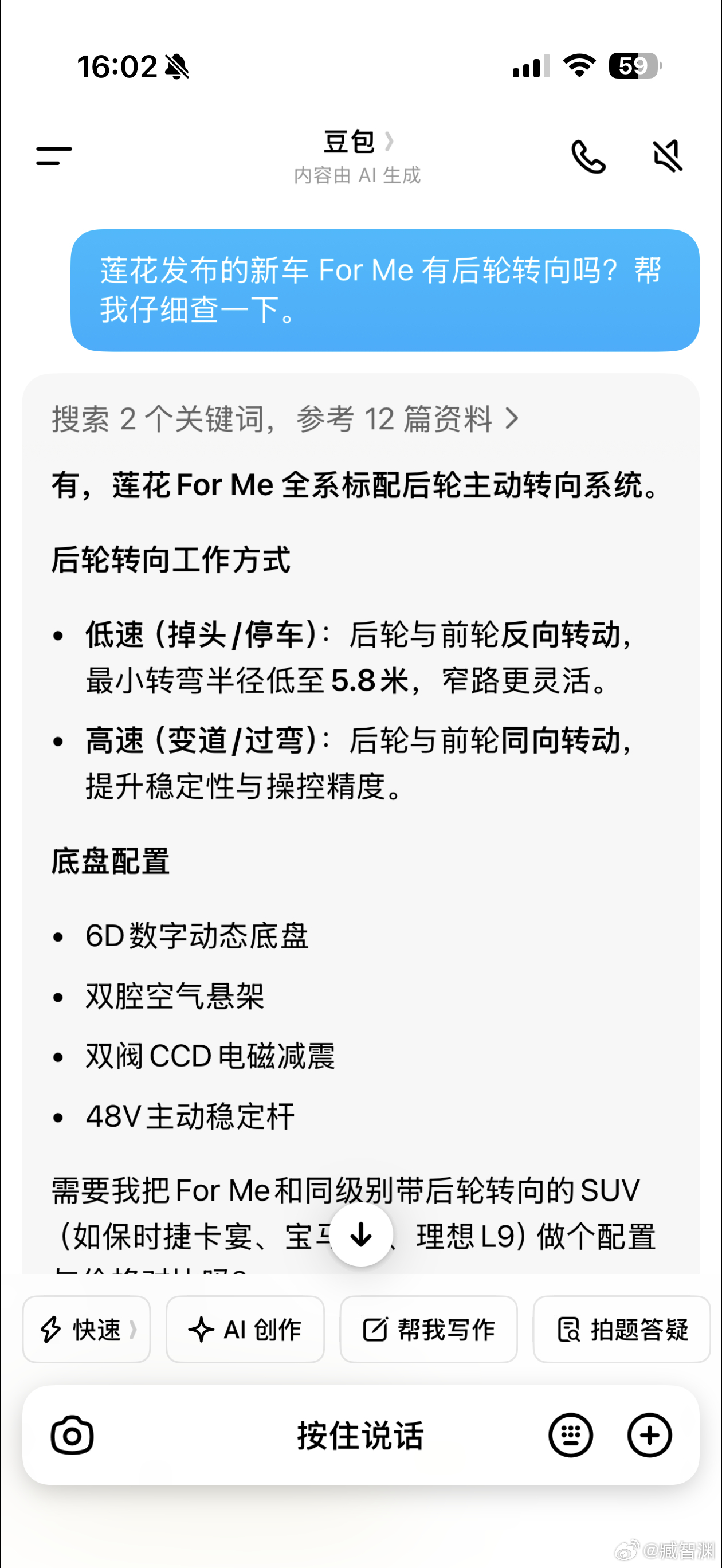 在我稍微有点含糊的地方,豆包是能坑我一次是一次啊,没法用!莲花FORME 销售确认了没有后轮转向的(和极氪8X/9X保持一致)。