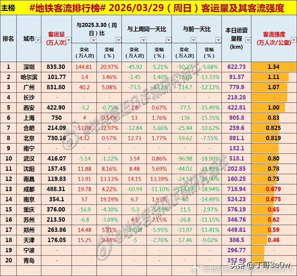 深圳地铁客流量周日实现835万人次以上,超过广州排名第一。[呲牙][呲牙][呲牙] 爆料 身边事 排行榜 周日 深圳 广州 2026年3月29日 星期天 全国重点城市轨道交通客流量排行榜: 深圳:835.30万深圳地铁 广州:831.80万广州地铁 上海:750.00万 北京:730.16万 成都: 488.31万 西安:422.90万西安身边事 武汉:416.07万 重庆:376.00万重庆地铁 南京:354.10万 郑州:263.86万郑州爆料 长沙:214万+长沙身边事 合肥:214.09万合肥地铁 苏州:213.50万苏州爆料 沈阳:157.45万 青岛:119万+青岛身边事 南昌:119.83万南昌地铁 宁波:101万+ 南宁:101万+南宁爆料 哈尔滨101.77万
