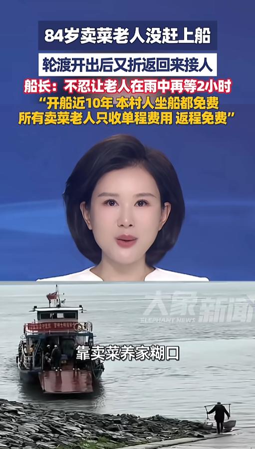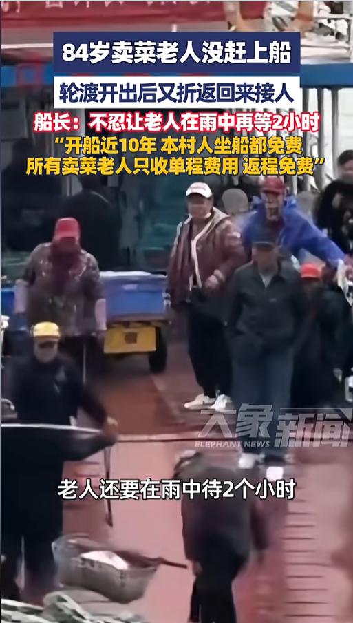 “刻进骨子里的善良!”近日,江西九江,一位卖菜老人扛着重重的货担,紧赶慢赶走在渡口,却发现已经开船了。老人边往前赶边挥手示意,没想到轮渡真的折返了回来,还下来人帮老人把担子挑了上去。船长:不然得雨里等两个小时! 据媒体报道,船长欧阳正光告诉记者,这位卖菜的老人今年已经84岁了,家里比较困难,平时就靠卖点菜维持生计。他在这里开船已经十年了,主要乘客也都是两岸卖菜的老人。 当时天还下着雨,老人赶到时,船已经开出去几十米了,但他看到老人之后,还是选择折返了回来。虽然自己折返得多花点成本,但如果不回来,老人就得在雨里等两个多小时,自己实在是于心不忍。 这些卖菜的老人,对他来说都是熟客了,也都很不容易。他能帮就选择帮一点,平时都只收单程的钱,返程就给他们免费了。依照他对老人的理解,真要是等下一轮,老人可能连中午饭都舍不得买了。 网友看后表示,中国人讲“老吾老以及人之老,幼吾幼以及人之幼”,虽然社会发展很快,大家逐渐向钱看齐,不少人情开始变得冷漠,但仍然有很多人并未忘记,曾经刻进骨子里的这种善良。也正是他们这些人的坚守,才在这物欲横流的时代,让大家感受到了温暖,找到了人间真情! 信息来源:《3月28日(报道)江西九江,84岁卖菜老人没赶上船,轮渡开出后又折返回来接人,船长:不忍让老人在雨中再等2小时,“开船近10年 本村人坐船都免费,所有卖菜老人只收单程费用 返程免费”》大象新闻
