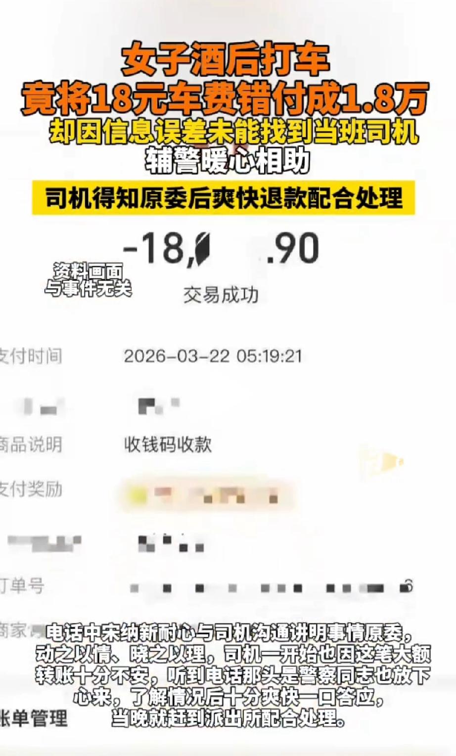 心太大了!武汉,蔡女士参加同学聚会喝了点酒,没成想打车回家时竟错把18元车费错付成18800余元,相当于多付了1000多倍!紧急报了警。本以为是一场追款大戏,万万没想到,司机这边正因这笔“天降巨款”坐立不安! 蔡女士参加同学聚会,可能是太高兴了,多喝了几杯。散场后,她叫了辆出租车回家,下车时迷迷糊糊地扫码付款,结果手一抖,直接把18元的车费,付成了18800多元! 这可不是小数目啊!当时喝醉了没感觉,直到第二天(3月22日)下午,蔡女士才猛然发现自己的账户少了这么一大笔钱,顿时急得不行。 她赶紧联系出租车公司,但因为信息没对上,一时半会儿也找不到那位司机。 眼看着这一万八千多块钱可能就这么没了,蔡女士心里越来越慌,最后只能抱着最后的希望,走进了武汉市公安局江汉区分局北湖街派出所求助。 值班的辅警宋纳新听了事情经过,马上开始帮忙。他仔细问了蔡女士乘车的时间、上下车的地点,还有那个“天价”的支付记录。 凭着这些线索,他一个接一个地排查,最后还真成功联系上了当班的出租车司机。 你猜怎么着?电话那头,司机师傅一听是警察同志打来的,反而松了一口气! 原来,这位师傅那天晚上收到这笔莫名其妙的“巨款”后,自己也懵了,心里一直不踏实,正愁着不知道该怎么把这笔“烫手山芋”般的钱还回去呢。 这剧情,是不是跟咱们想的不太一样?本以为会是一场“追款大战”,结果变成了“双向奔赴”。 在宋纳新的见证下,这位好心的司机师傅当晚就赶到了派出所,把多收的钱一分不少地退给了蔡女士。钱款失而复得,蔡女士激动得连连道谢。 有网友说:“这才是咱们武汉的‘拐子’(大哥)!不是自己的钱,拿着心里不安,好样的!” 想想看,18800元对谁来说都不是小数目,够普通人好几个月工资了,蔡女士这一时的疏忽,差点就造成了难以挽回的损失; 换作有些人,可能就偷偷收下了,可这位司机却因为这笔钱坐立不安,这就是诚信的力量啊! 我们常说“金钱是考验人性的试金石”。面对一笔意外之财,是选择默默收下,还是主动归还? 这位司机师傅用他的行动给出了最响亮的答案。他的“不安”,恰恰是他内心善良和正直的体现。 最后,为拾金不昧的司机师傅点个赞,也为耐心负责的辅警宋纳新点个赞!希望咱们身边这样温暖的故事,能越来越多。