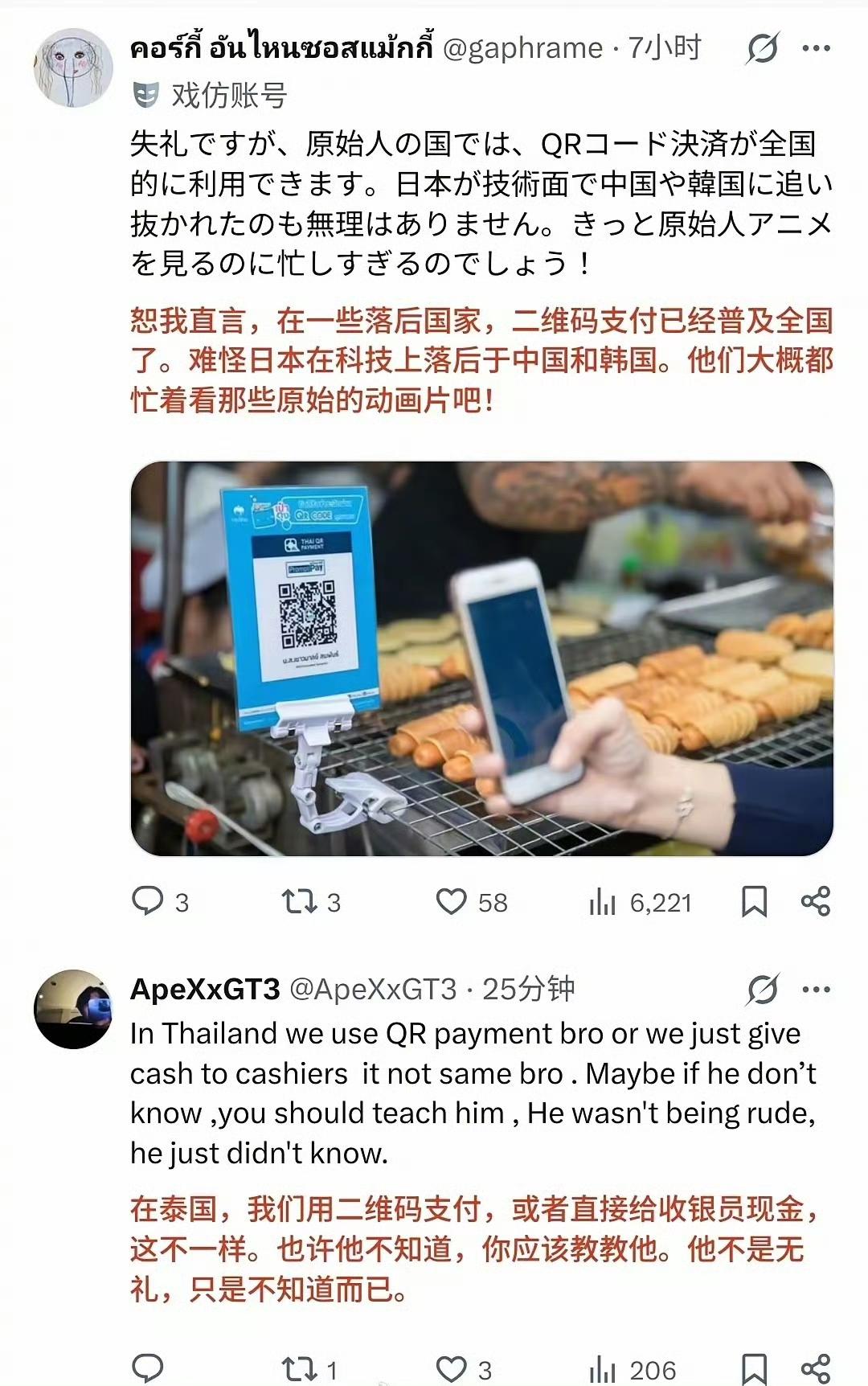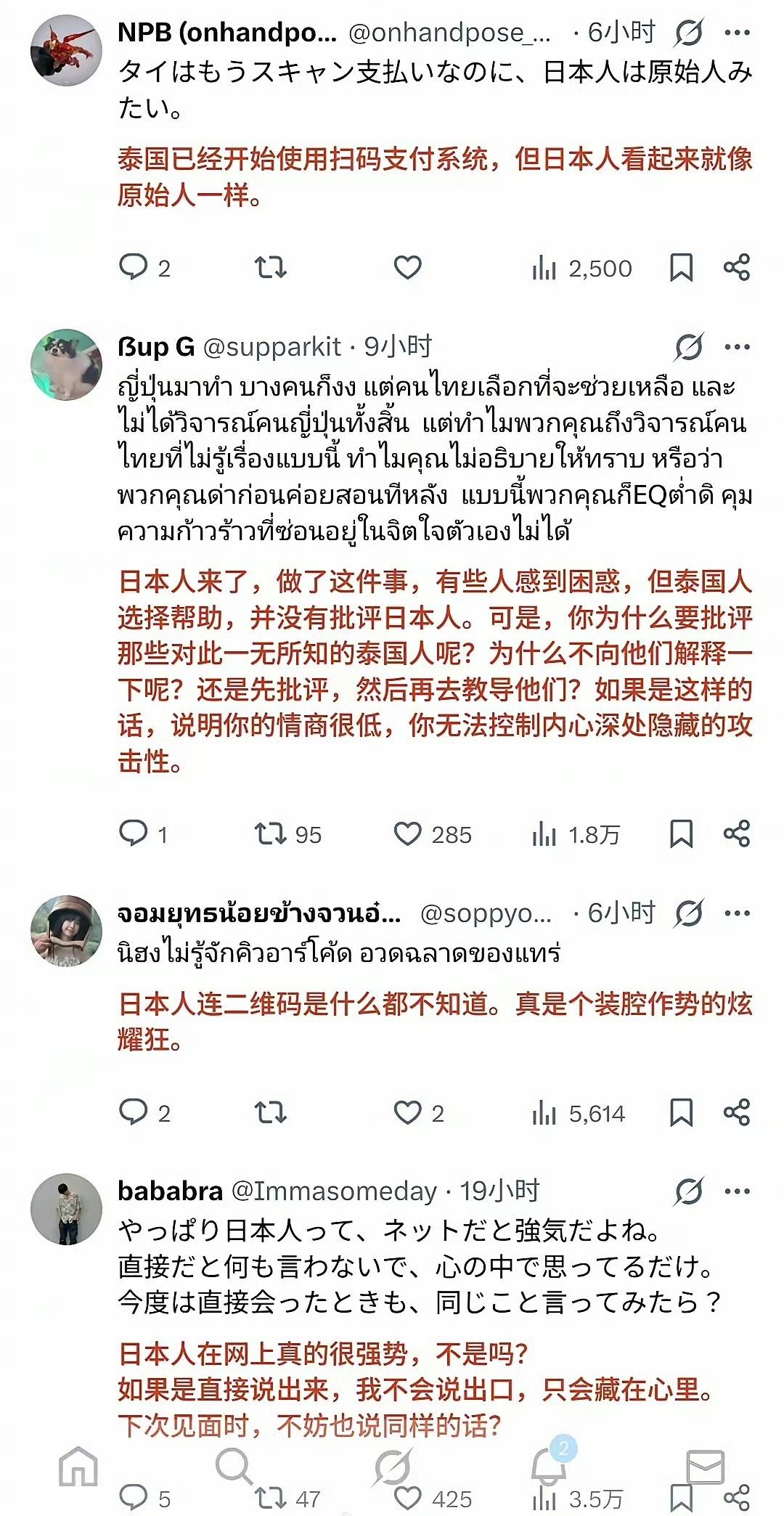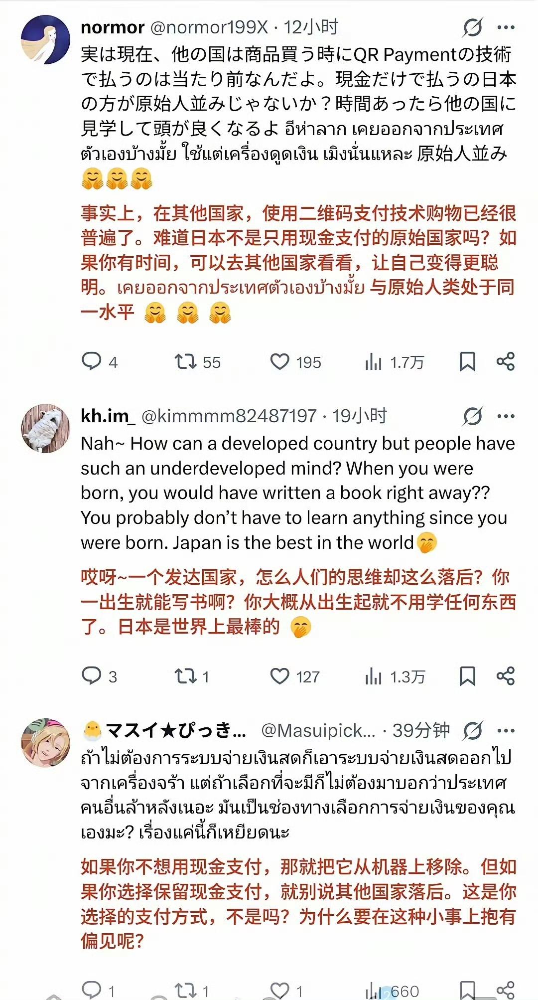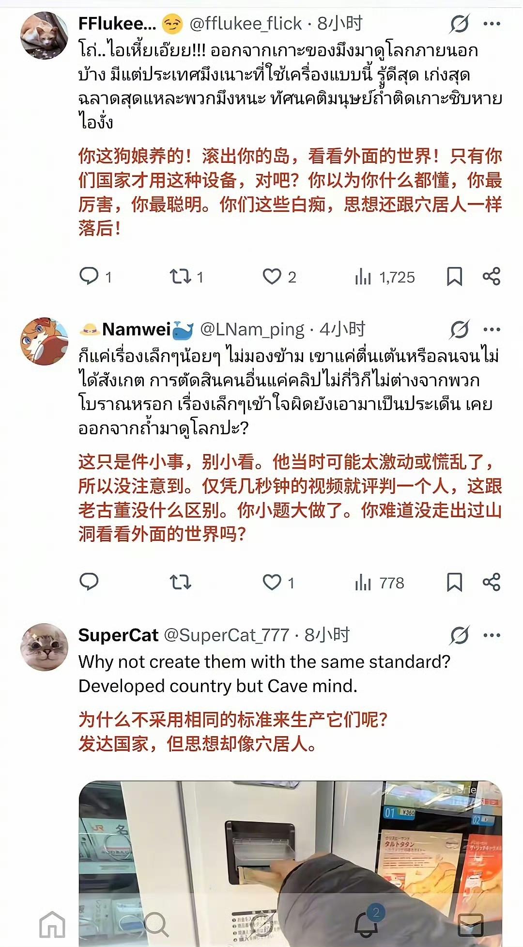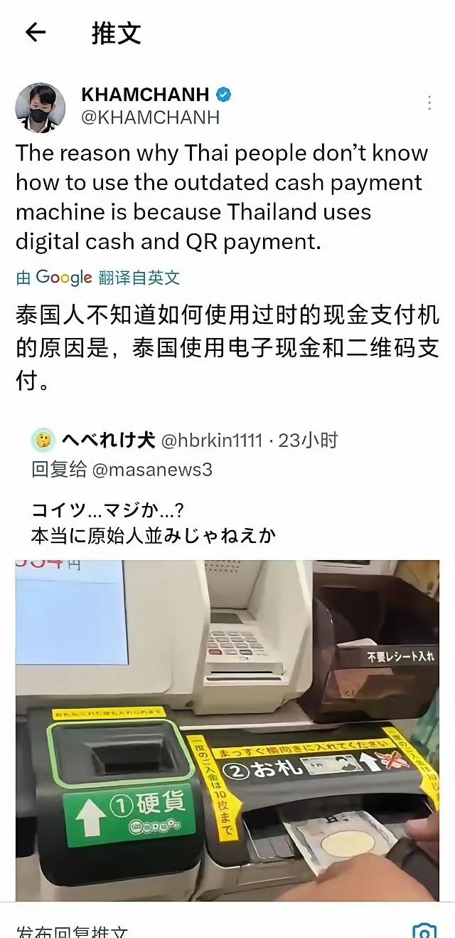 日本网友和泰国网友在网上打起来了!!! 日本人嘲笑泰国游客不会使用日本“先进”的现金支付机,嘲笑泰国人是原始人。 泰国网友表示,泰国早就使用电子支付了,使用现金支付的日本人才是原始人。 中国游客日本 海外条友说 海外生活分享
