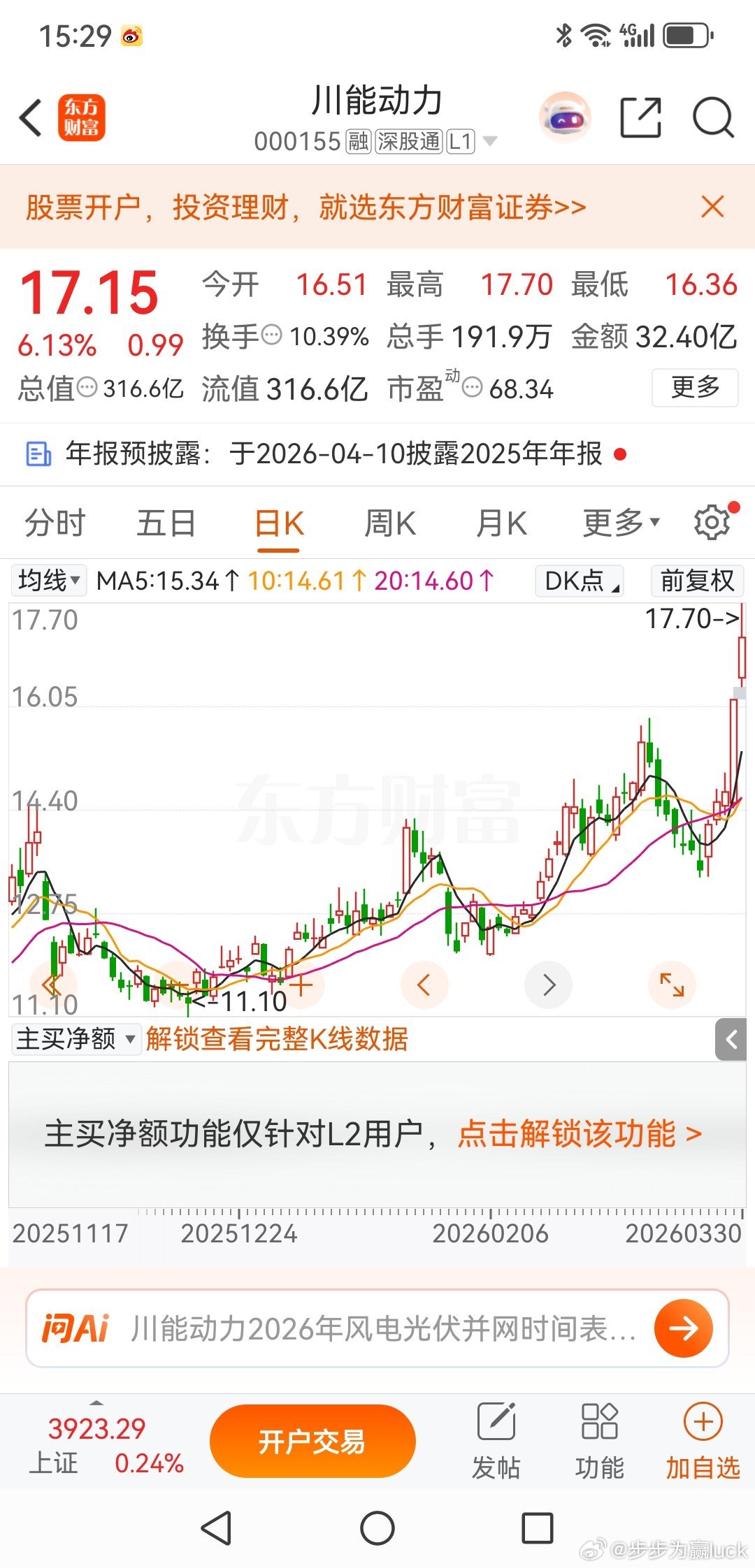 川能动力,高位震荡3-5天后将迎来下跌川能动力,这是周末一位群友问的票,群友的问题是下周是否可以买入,理由是突破。我的回答是不可以买入,理由是十次突破九次假。在A股市场中有很多小白迷信已突破和创新高,这是非常糟糕的事情,事实是突破和创新高,大部分都是坑爹的。川能动力,上周五涨停,量能虽然有所放大,但总体上还是属于合理范围,所有今天有溢价是合理的。问题是明天是否还有溢价,先不着急回答,先看看今天的量能。川能动力,今天成交了32.4亿,换手10.39%。这个成交量是该股5年以来最大的一次,巨量代表什么?历史巨量代表什么?代表,这个筹码高度不稳定,在你看多的同时,有很多人在卖。天量见天价,我不敢说他马上会死,但是毫无疑问今天进来想吃肉难度会很大,明天顺利出局依然是万幸了。欢迎加入我们的免费交流群财经股票