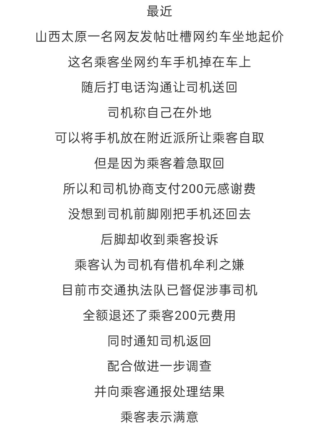 太原这位网约车司机只能自认倒霉了。本来说好给200块感谢费把手机送给乘客,结果被乘客反手一个投诉,不仅退还200块,还贴了油费和时间! 事情是这样的。 近日,太原一位乘客坐网约车,下车后才发现手机落车上了。赶紧联系司机,对方也挺实在,说自己这会儿在外地,可以把手机送到附近派出所,让乘客自己去拿。 这方案其实没毛病吧?安全、公正,谁都不吃亏。 可乘客着急啊,等不了。 于是主动提出来:我给你200块感谢费,你专门跑一趟送过来吧。 司机也答应了,特意跑腿把手机送到位。 没想到,手机刚还回去,乘客反手就是一个投诉! 理由是司机“借机牟利”。 啊这?不是你主动给的吗?人家跑一趟,油钱时间不算钱? 更绝的是,当地交通执法队介入后,直接督促司机全额退还了200块,还通知司机回去配合调查。 乘客这边呢,处理结果一通报,表示“满意”。 整个看下来,司机怕是要委屈哭了。 你说这200块,是牟利还是跑腿费? 真要较真,人家本来可以放派出所一走了之,是你着急才加价求人,回头又拿规则说事儿,这不妥妥“过河拆桥”吗? 规则要守,但人情味儿也不能全丢了。 现在这结果,看着是“维权成功”,实际上,以后谁还敢好心给你跑腿送东西? 你觉得,这200块该退吗? 网约车平台规定