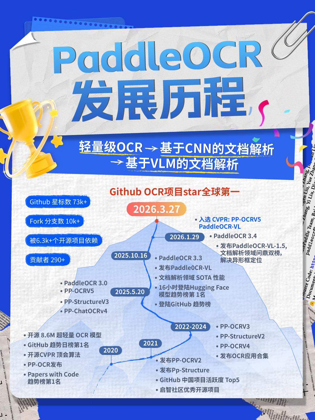 分享一则好消息: 文心衍生模型PaddleOCR在GitHub上的Star数突破73.3K,首次超越谷歌旗下开源OCR标杆产品Tesseract OCR(73.2K),成为全球Star数最高的OCR项目🌟。 🥸Tesseract OCR是资深的老前辈: 诞生于1985年,最初由惠普实验室研发,2005年开源后由Google接手维护并持续迭代,是OCR领域延续近四十年的技术标杆,长期位居GitHub OCR项目Star数榜首。 🤓PaddleOCR则是快速崛起的新星: ● 基于文心大模型训练而来,支持超100种语言识别,用户覆盖160个国家和地区,是文心大模型多模态能力的重要组成部分。 ● 2024年起,在GitHub上的Star爆发式增长,如今成为中国开源项目首次在OCR领域超越谷歌主导的标杆产品。 ● 1月29日发布的最新版PaddleOCR-VL-1.5,在 OmniDocBench V1.5 榜单中取得了全球SOTA成绩。 与此同时,还有两则好消息: 1. 🫶🏻PaddleOCR同步升级服务能力: 官网免费每日解析页数由1万提升至2万,用户还可通过OpenClaw直接调用PaddleOCR Skill,免费获取高精度PDF解析能力。 2. 🤝PaddleOCR OCEAN生态联盟正式成立: 面向核心开源贡献者、深度企业用户及全球平台伙伴开放,首批成员包括Hugging Face、Dify、RAGFlow、Cherry Studio、Milvus等全球平台伙伴,将共同推动OCR技术在更广泛场景中的应用落地。