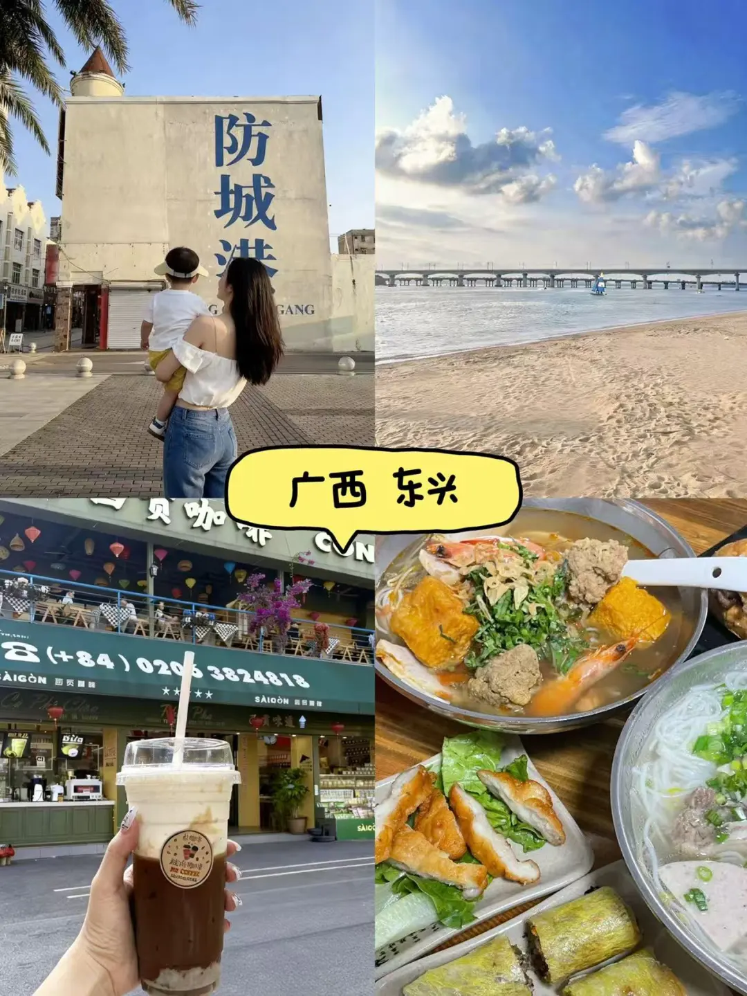 这真是我觉得被低估的一座边境小城,南宁坐大巴1.5小时或高铁到防城港北再转车,这座中越边境小城冬天能穿短袖(18–22℃),万尾金滩几乎没人,孩子可以自由挖沙赶海。越南街小吃5元起,滴漏咖啡+法棍早餐一秒穿越