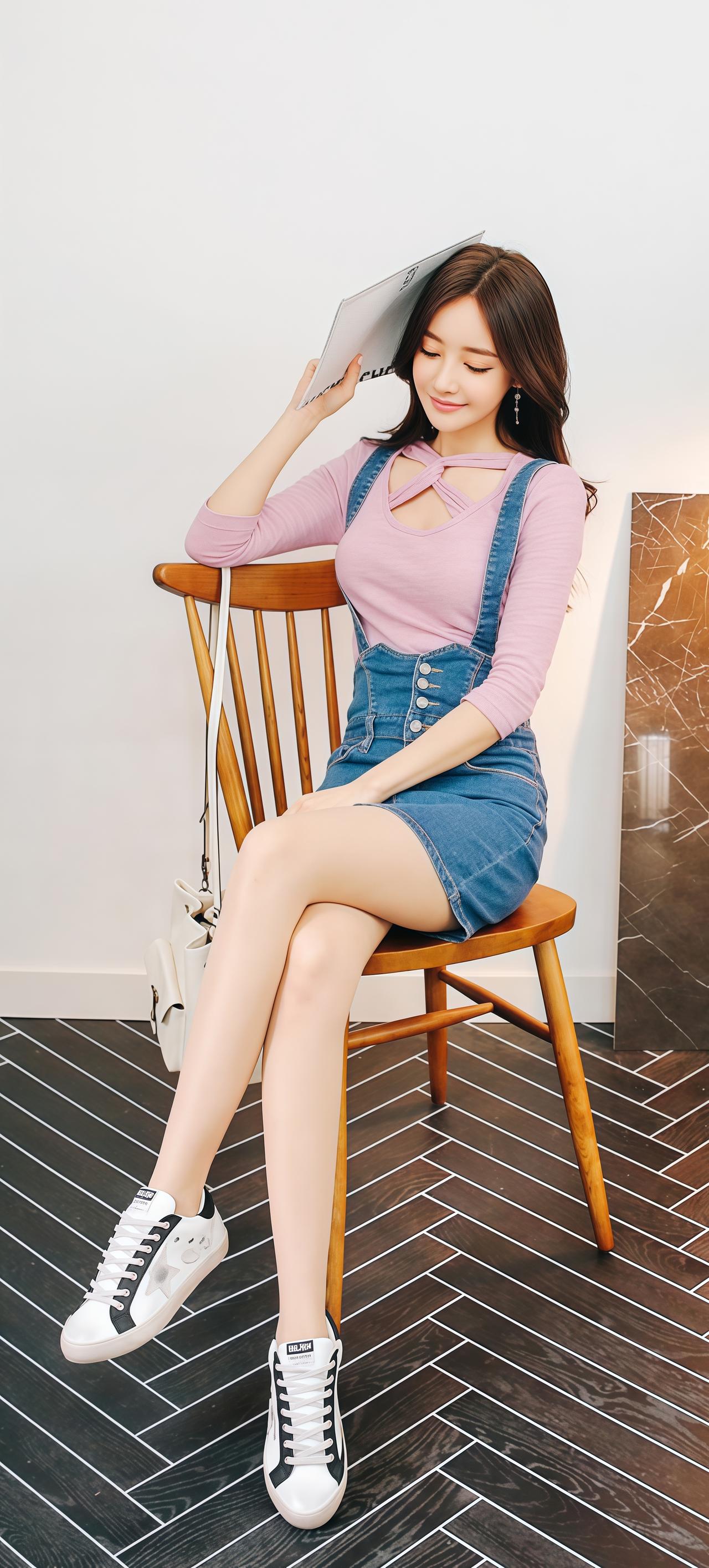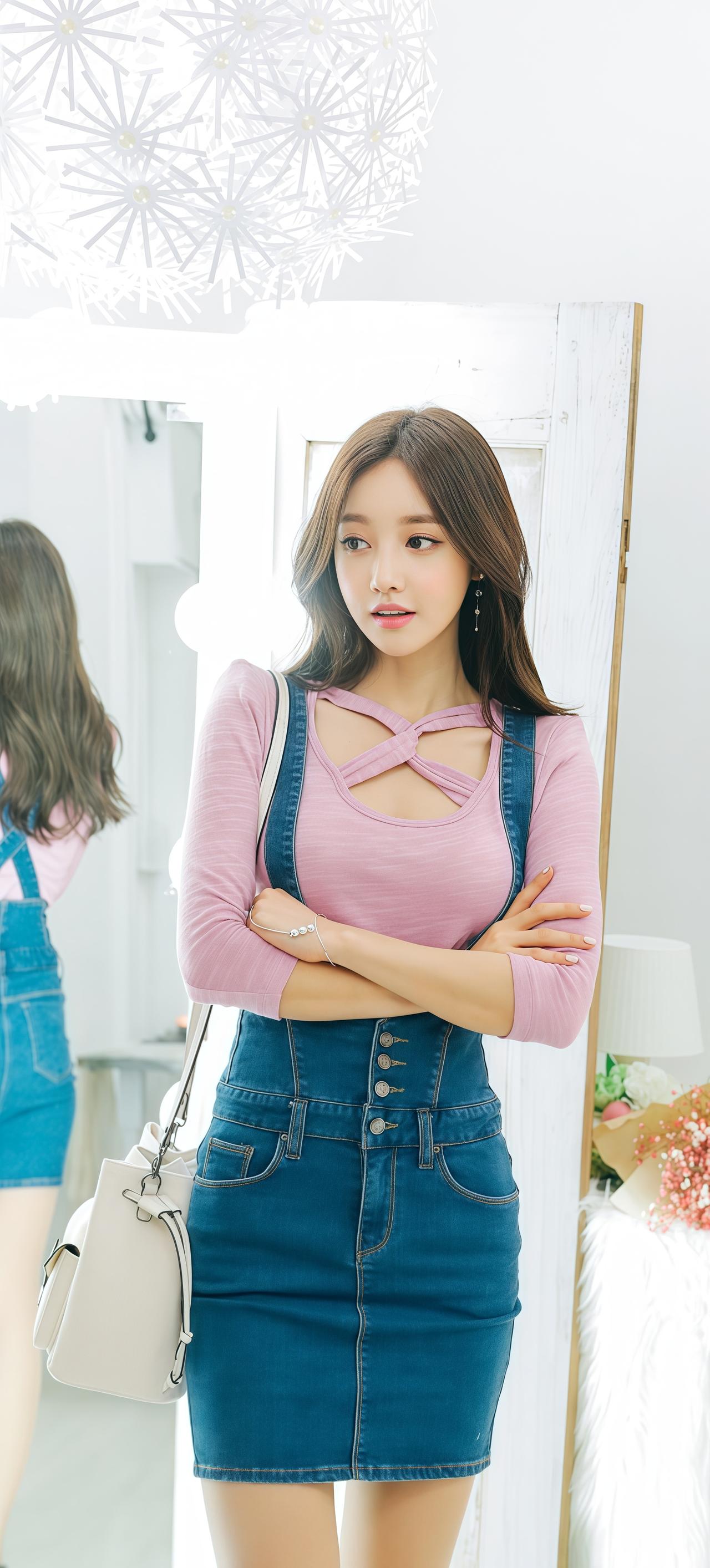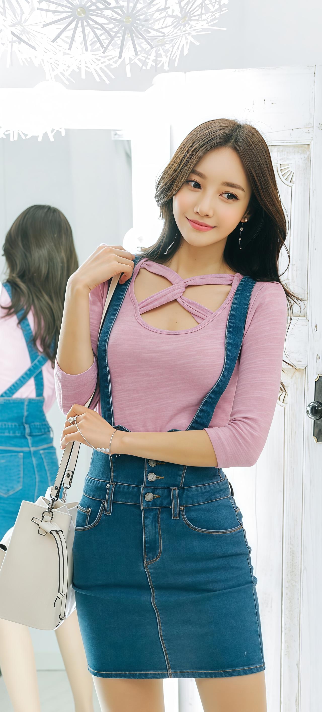 甜美粉色长袖上衣搭配牛仔背带裙,清新可爱,少女心满满!