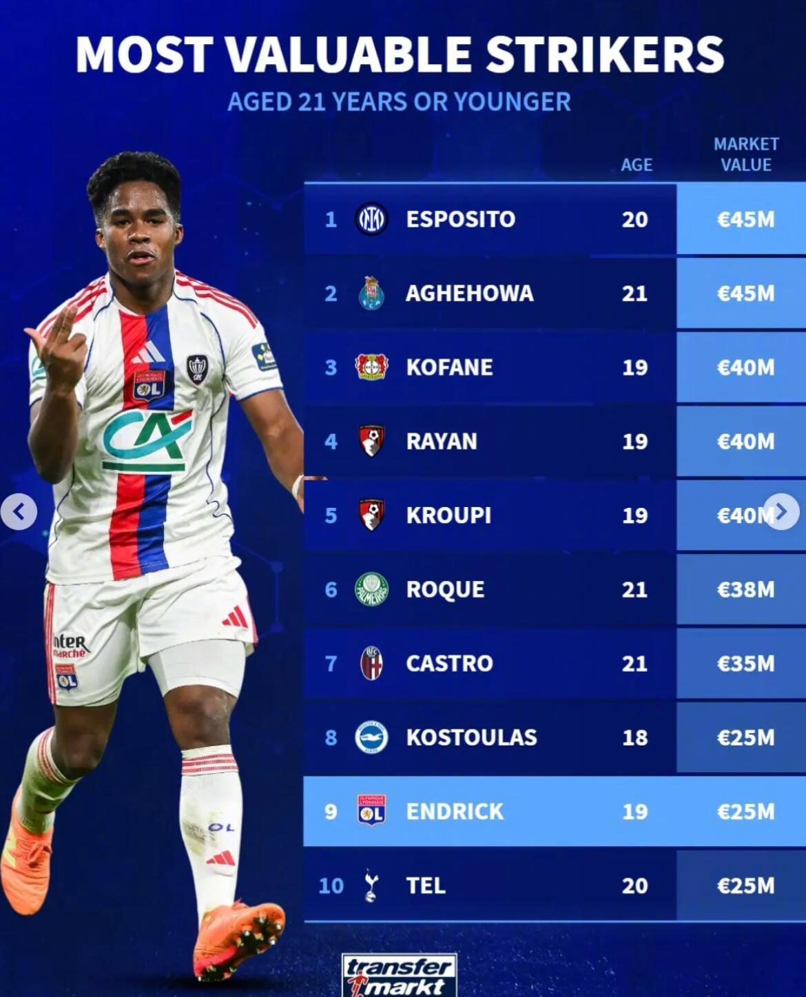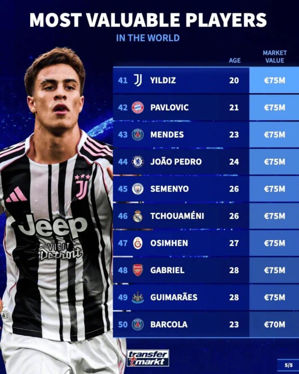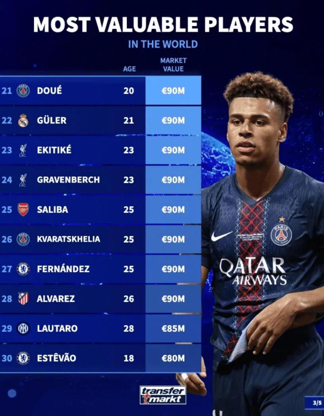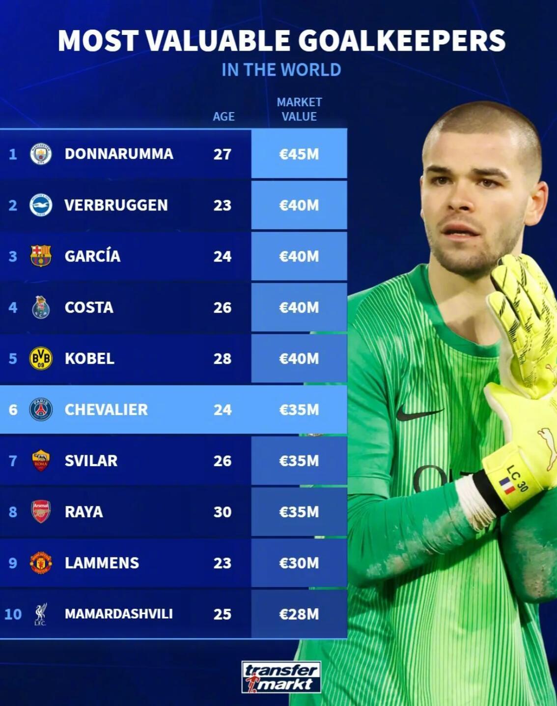 最新德转身价变化! ★当今足坛身价最高的50名球员! 目前身价达到一个亿的球员一共有20名,另外前十当中,英超球员仅有2人,作为最富裕的联赛,英超缺乏真正顶尖的门面球员。而在20-50名之间,英超占据半壁江山,又证明他们确实是有钱的,所以整体实力超过其他联赛。 ★门将身价榜! 现在身价最高的门将是曼城的多纳鲁马。 ★U21中锋身价榜! 皇马外租法甲锻炼的恩德里克排名第九。 ★德国球员身价榜! 穆夏拉是德国球员中身价最高的,维尔茨在英超混的不咋滴,身价已经开始下滑了。 ★今夏合同到期的英超球员身价榜! 利物浦中卫科纳特是免签市场那条最大的鱼。