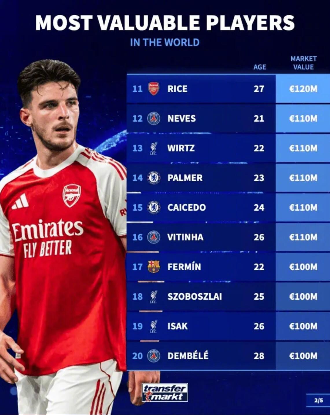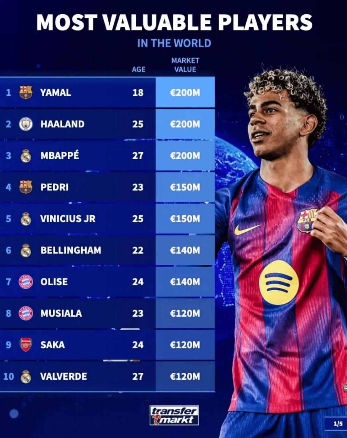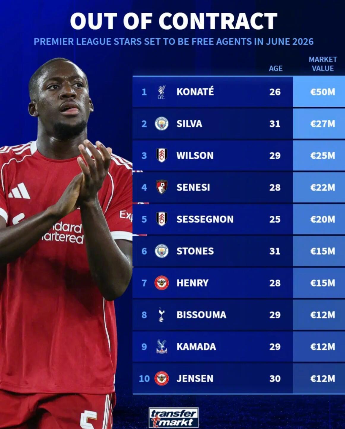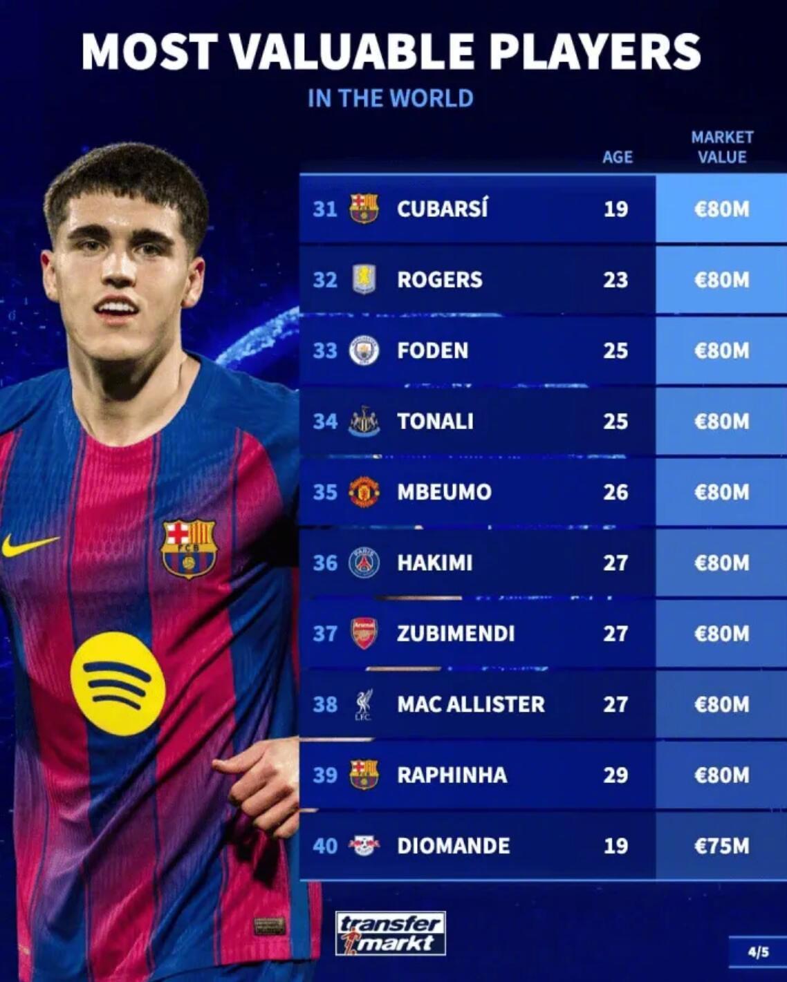 最新德转身价变化! ★当今足坛身价最高的50名球员! 目前身价达到一个亿的球员一共有20名,另外前十当中,英超球员仅有2人,作为最富裕的联赛,英超缺乏真正顶尖的门面球员。而在20-50名之间,英超占据半壁江山,又证明他们确实是有钱的,所以整体实力超过其他联赛。 ★门将身价榜! 现在身价最高的门将是曼城的多纳鲁马。 ★U21中锋身价榜! 皇马外租法甲锻炼的恩德里克排名第九。 ★德国球员身价榜! 穆夏拉是德国球员中身价最高的,维尔茨在英超混的不咋滴,身价已经开始下滑了。 ★今夏合同到期的英超球员身价榜! 利物浦中卫科纳特是免签市场那条最大的鱼。
