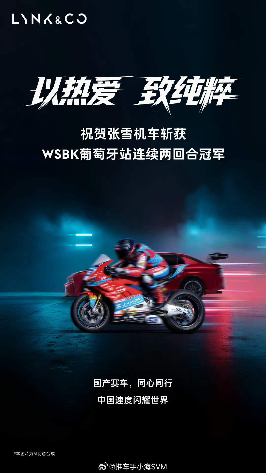 领克祝贺张雪机车夺冠两个中国速度。领克在赛车领域的地位,可以说是“全球TCR赛事的统治级力量”,领克不仅是中国品牌在国际顶级房车赛中成绩最辉煌的代表,更成为首个实现“自主研发量产TCR赛车”的中国车企。