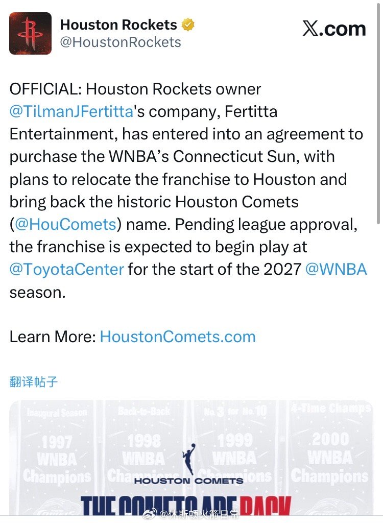 火箭官方官宣老板费尔蒂塔收购WNBA太阳队成功,将把球队迁往休斯顿,并改回休斯顿彗星队