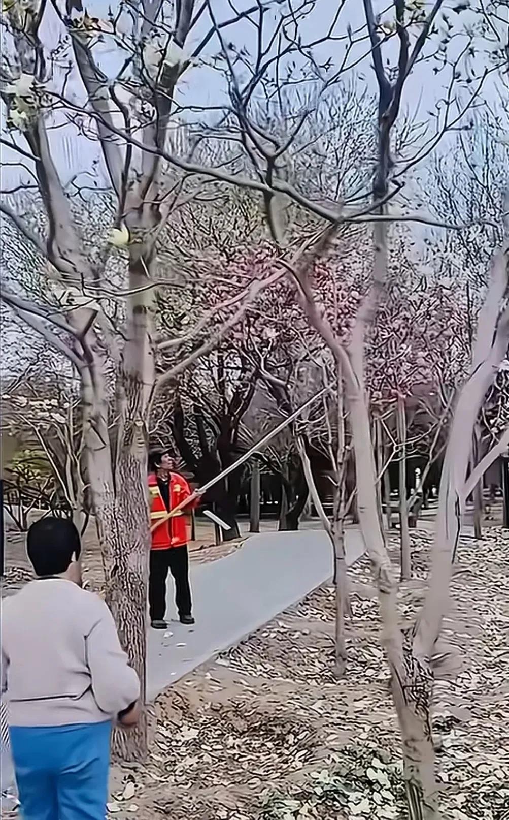 满树盛开的玉兰花招谁惹谁了?居然被养护工人用竹竿打落,这操作也是没谁了!这是专业的养护人员吗?开得好好的花朵,就这么被糟蹋了! 公园的回应也让人啼笑皆非,清理残花用得着竹竿吗?员工再不理解也应该能分得清竹竿和笤帚吧!另外,开除涉事保洁和带班人员是为了甩锅吗?