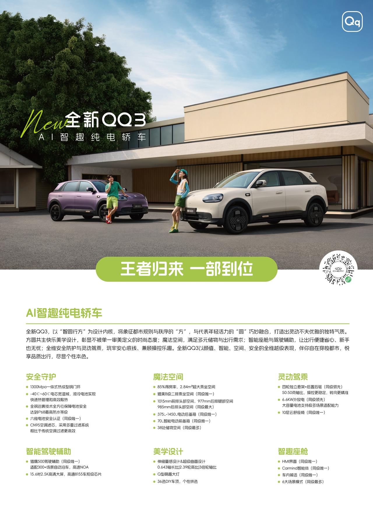奇瑞全新纯电QQ3上市了 310km续航二款5.89万/6.79万 420km续航二款6.89万/7.89万 这价格大家觉得怎么样?这是要追着星愿打啊! 全新纯电平台,后置后驱,50/90kw电机,液冷电池,2C快充(≈60/80kw) 50:50荷轴比,四轮独立悬挂 外观造型很漂亮啊,内饰也是很多椭圆形元素,软包给的还行; 2.7米轴距二排空间也是卖点、座椅下方35L抽屉式储物盒,包括70L电动开启前备箱等 起步纯电续航确实不如MG4和零跑A10的400多km来的实惠,但大厂造的车型底线就是高?! 什么意思,即使是大厂的入门车型,整车品质还是比新势力的有保证?! 包括整车开起来的底盘行驶品质,我相信应该会很不错,至少不输星愿,不知道能否和MG4打打?我会尽快去试驾体验下告诉大家。 全新QQ3 全新QQ3新车上市