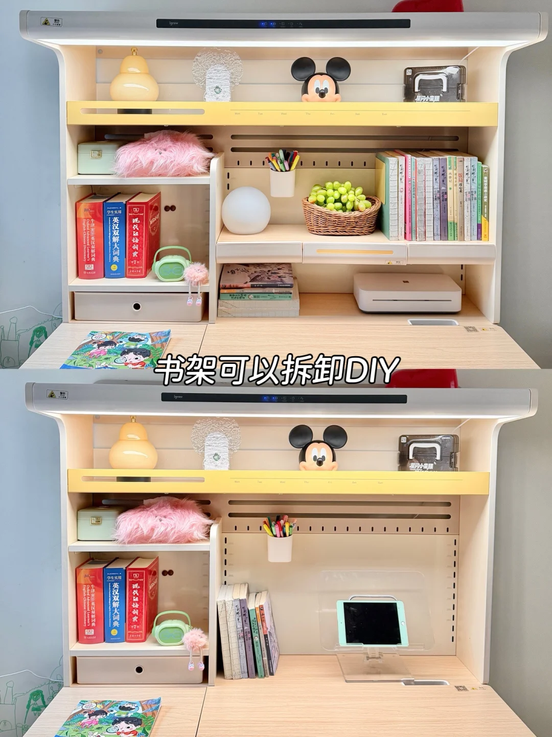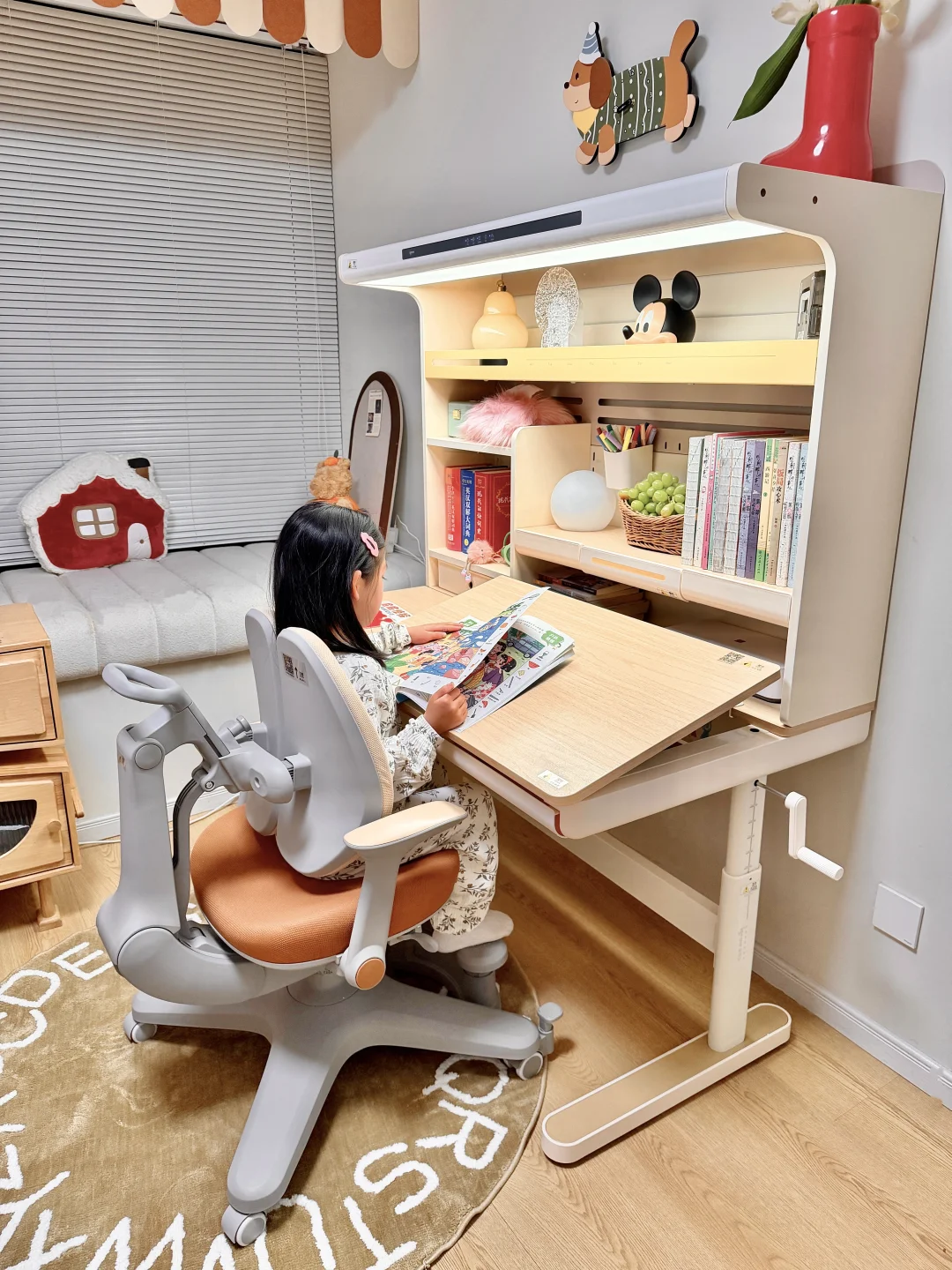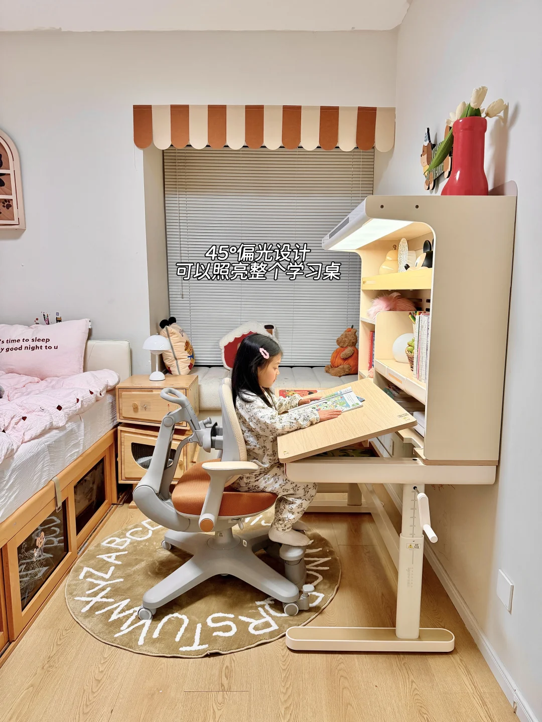 ⚫ 自带的一体护眼灯,省去了另外购买大路灯费用和功课时间,关键还不占空间,45°偏光 双光源设计,整个桌面都可以照亮