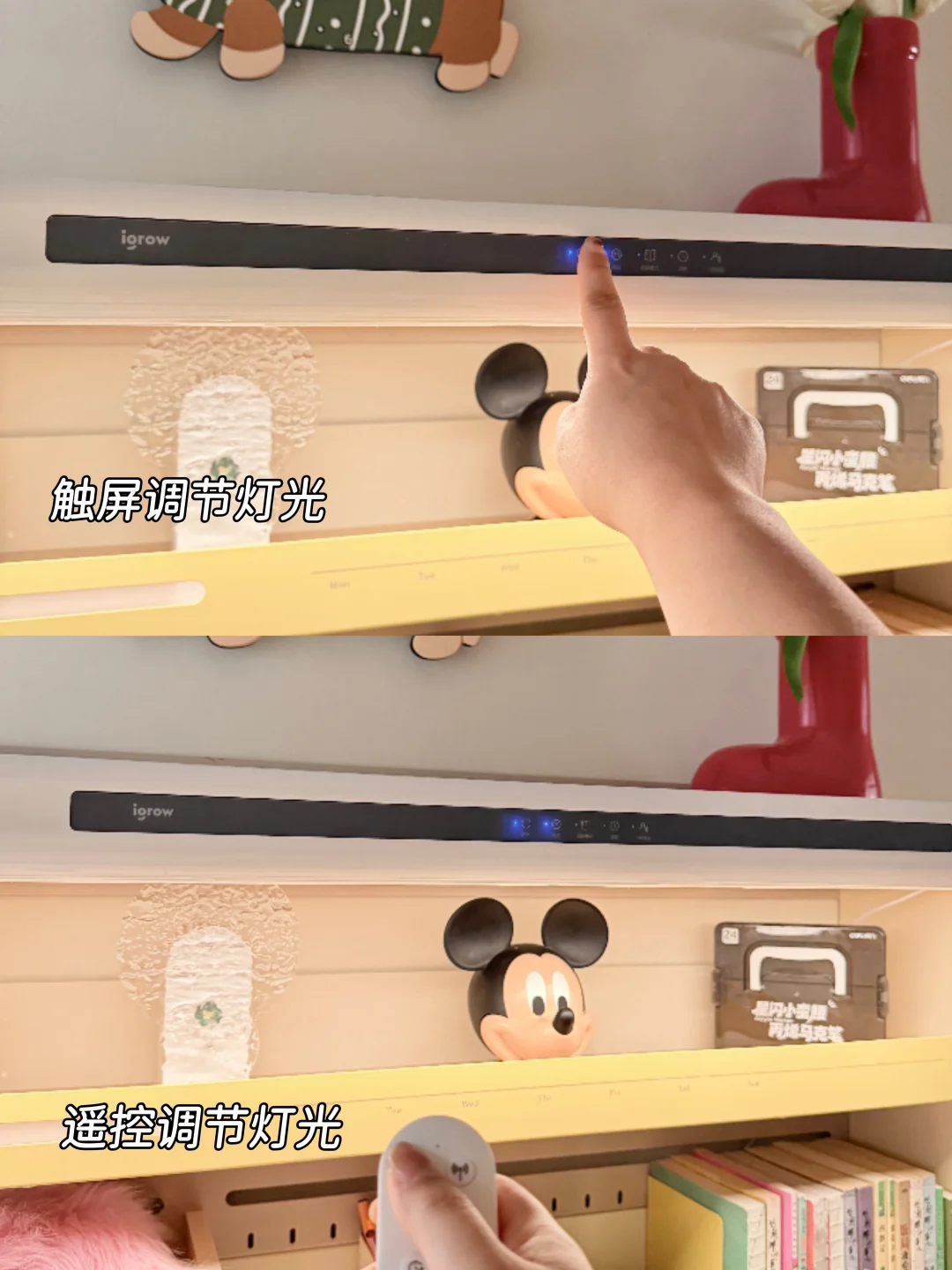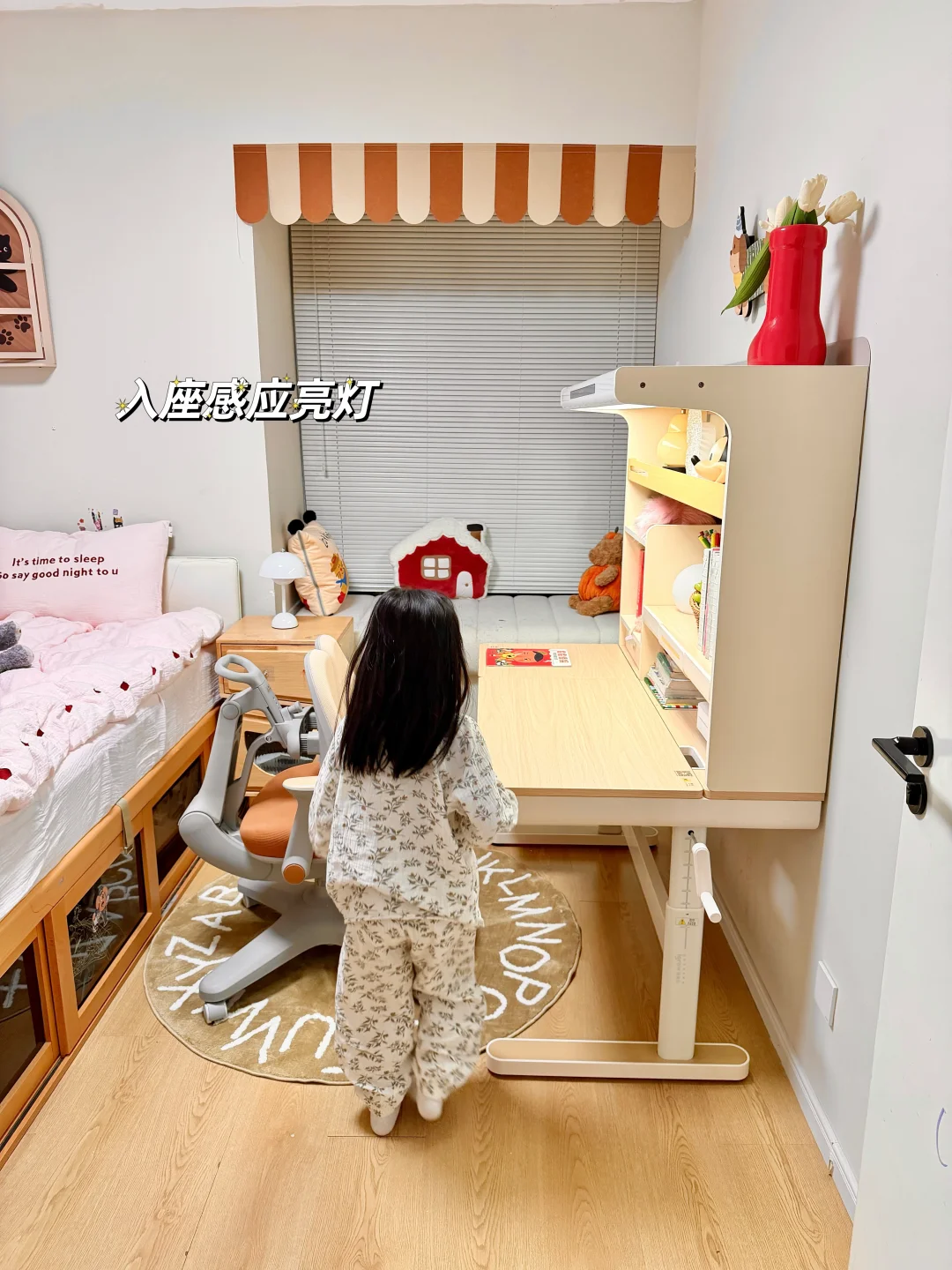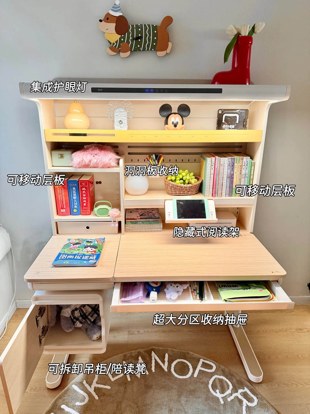 ⚫ 自带的一体护眼灯,省去了另外购买大路灯费用和功课时间,关键还不占空间,45°偏光 双光源设计,整个桌面都可以照亮