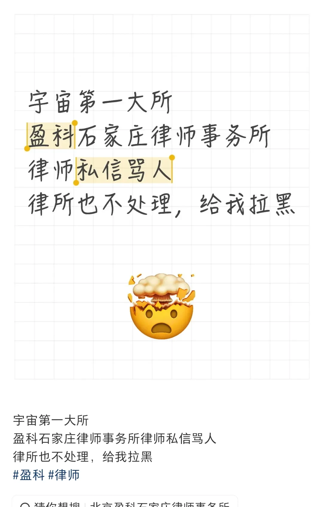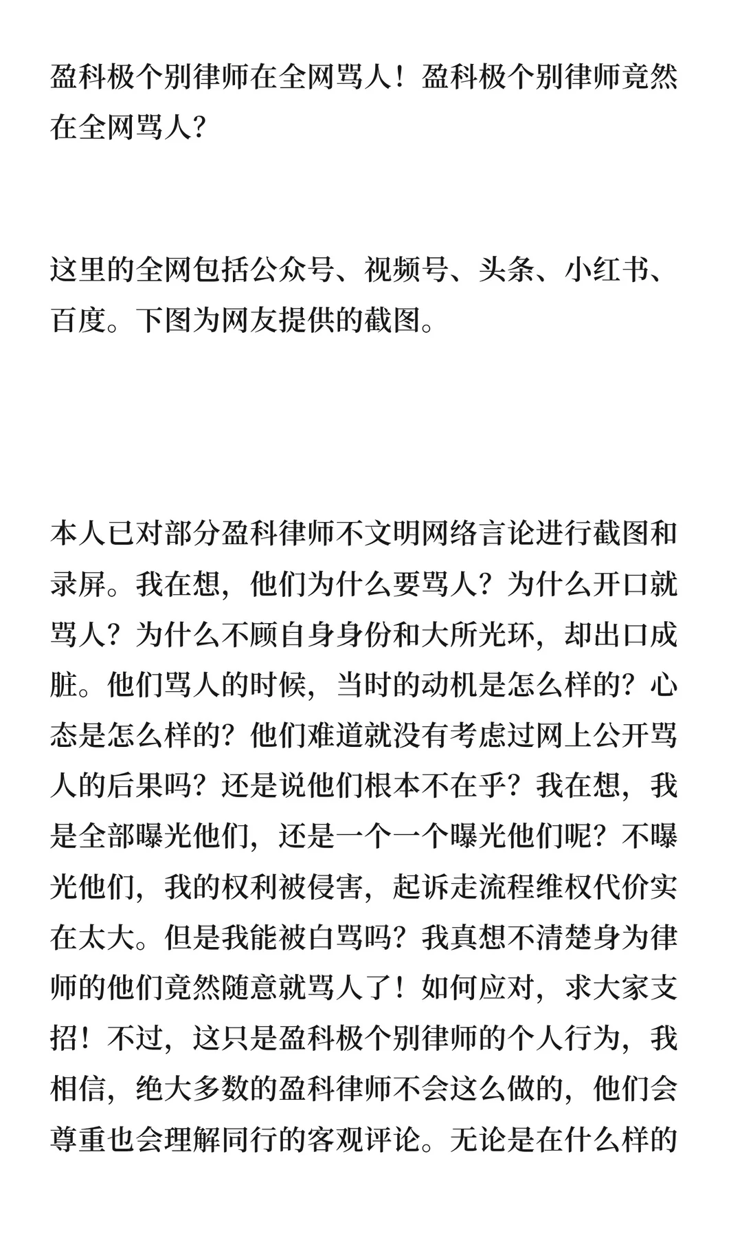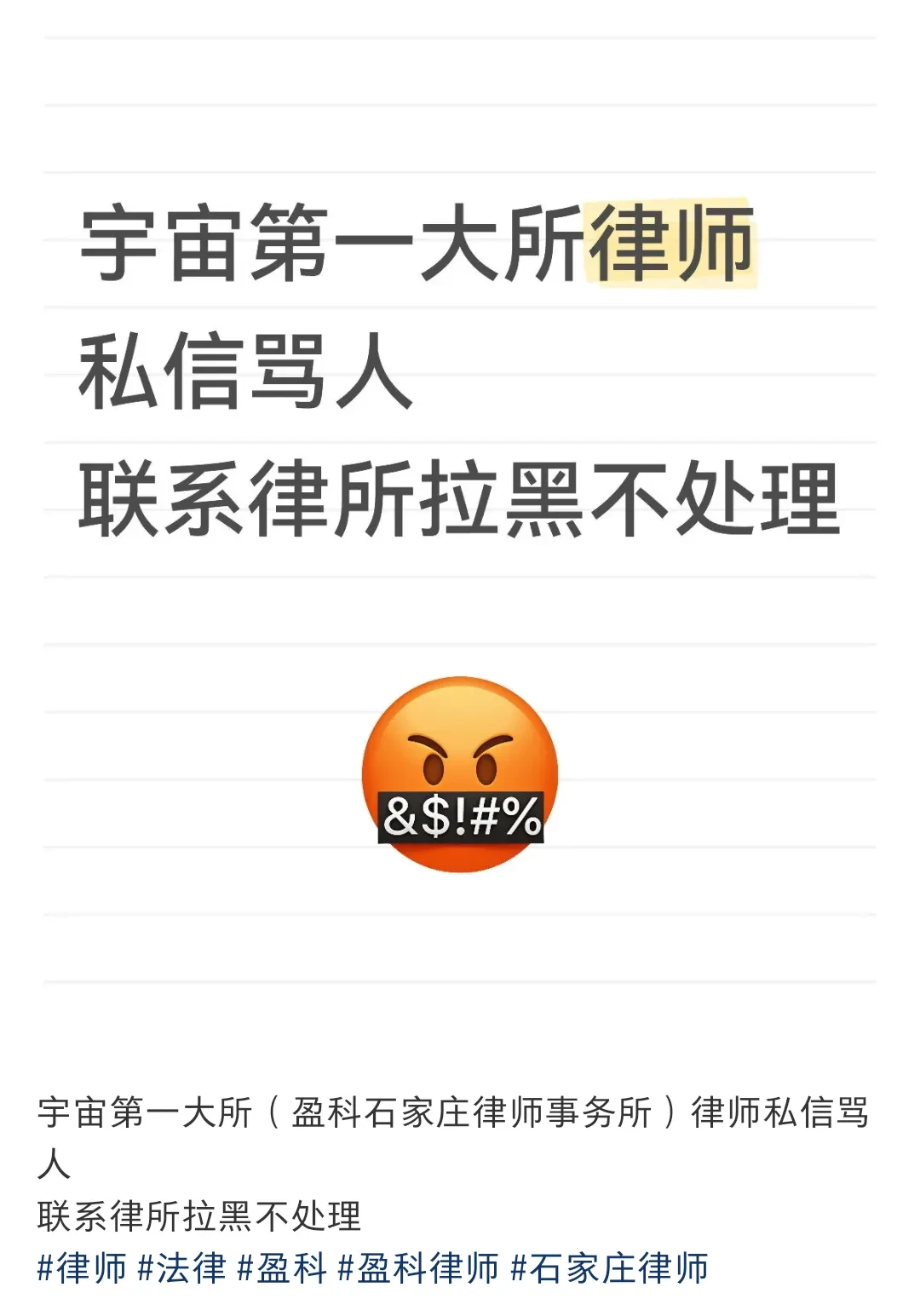 盈科律所个别律师在全网公开骂人,包括公众号、视频号、头条等平台,引发广泛关注。这些行为不仅损害了律师职业形象,也违反了法律和职业道德。作为律师,应尊重同行,避免无端指责和辱骂,维护行业声誉。