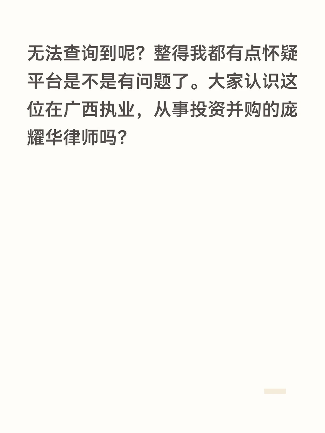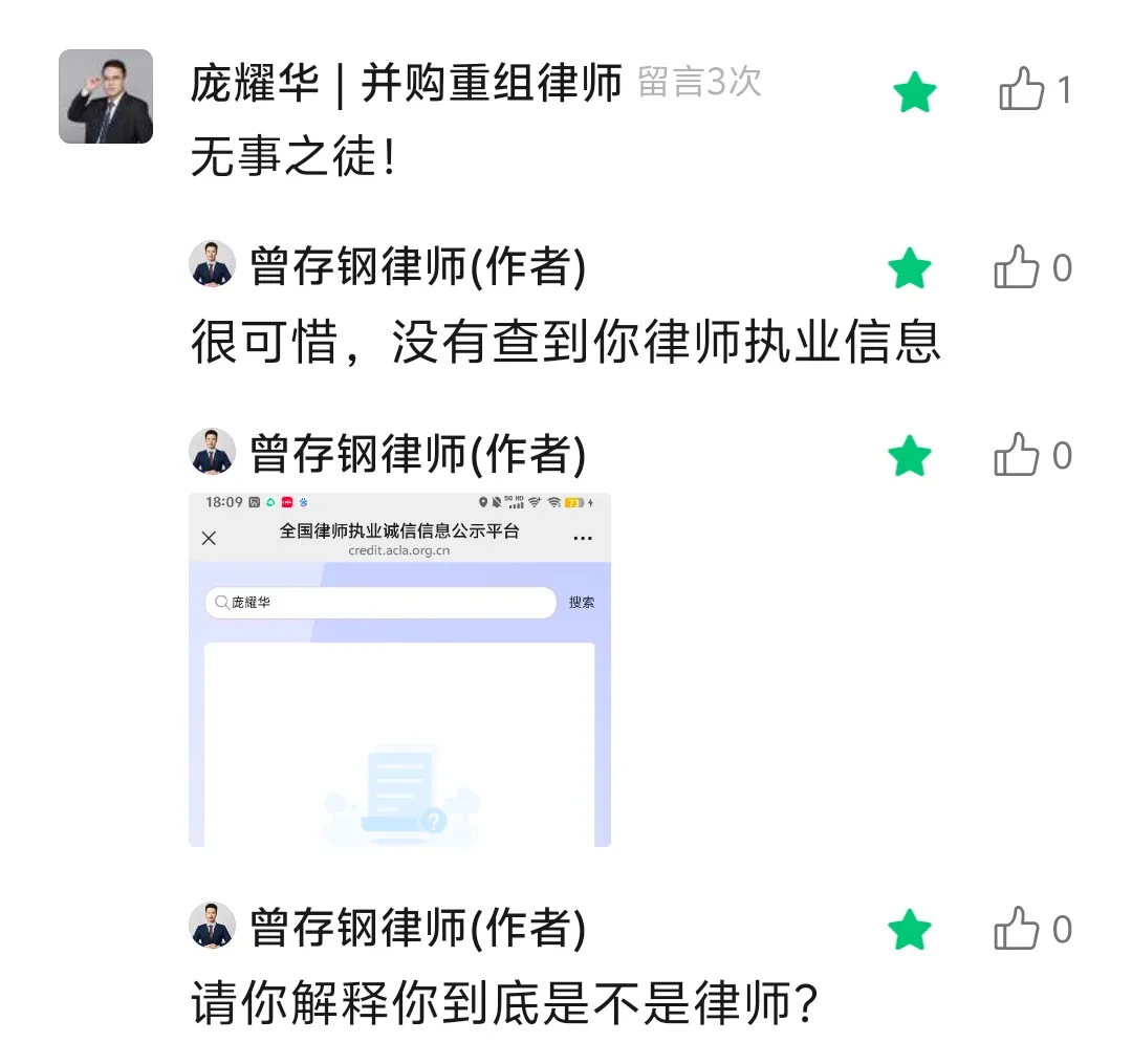 广西庞耀华是律师吗? 在我的公众号都一篇文章评论区,有这样一位账号名称为“庞耀华|并购重组律师”,他在我的文章评论区评论“无事之徒”。 我在全国律师执业诚信信息公示平台查询发现,全国没有一个叫庞耀华的律师。 我将查询结果发给他一天后,仍未予回应,而且依然没有变更名称,依然还自称为律师。 我想问的是,是不是有些律师确实无法查询到呢?整得我都有点怀疑平台是不是有问题了。大家认识这位在广西执业,从事投资并购的庞耀华律师吗?