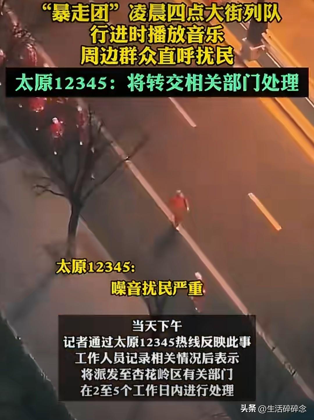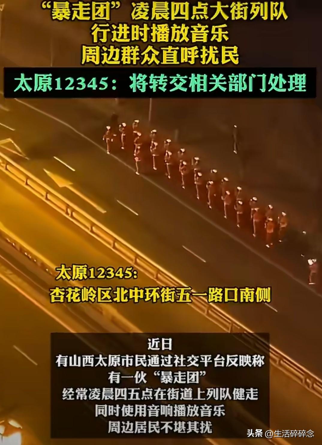太原凌晨4点“暴走团”炸街!统一着装列队放歌,住户不堪其扰直接报警 凌晨4点,天还没亮,山西太原街头却突然响起震天响的音乐,还有整齐划一的脚步声,不少住户直接被吵醒,忍无可忍选择了报警。 近日,山西太原杏花岭区五一路与北中环街交叉口南侧,一支20多人的“暴走团”彻底火了。 从现场视频能看到,这群人穿着统一的橙红色服装,排成整齐的队伍,在非机动车道上大步前行,队伍最前面还放着大功率音响,音乐声放得特别大 。凌晨4点多,周围一片漆黑,只有他们的队伍格外显眼,音乐声在空旷的街道上回荡,把熟睡的住户硬生生吵醒。 不少住户吐槽,上一天班本来就累,结果每天都被这些人折腾的不行,想睡睡不着,上班、上学都没精神。有人试着开窗提醒,对方根本不理会,依旧我行我素,音乐声丝毫没减小。 无奈之下,被打扰的住户只能选择报警,希望能制止这种扰民行为。 事情曝光后,记者也联系了相关部门了解情况,没想到却出现了“踢皮球”的情况。社区工作人员表示,暴走团活动的地方是市政道路,不归社区管,应该找城管部门。 可城管部门却说,噪音污染不属于他们的管辖范围,遇到这种情况只能建议住户报警处理 。 最后,记者拨打了太原12345政务热线,工作人员记录了相关情况,表示会把问题转交给杏花岭区相关部门,承诺2-5个工作日内处理 。 这件事也引发了网友的热议,大家看法不一 。有人觉得,健身是好事,锻炼身体值得肯定,但不能以牺牲别人的休息为代价。凌晨4点是大家睡得最沉的时候,放这么大声音的音乐,确实太过分了。 也有网友建议,暴走团可以换个时间,比如早上6点以后,或者把音响换成耳机,既不影响自己健身,也不打扰别人休息。 目前,这件事还在处理中,后续结果还需等待官方通报 。 大家怎么看待凌晨暴走团放音乐扰民的事?你遇到过类似情况吗?评论区聊聊你的看法。