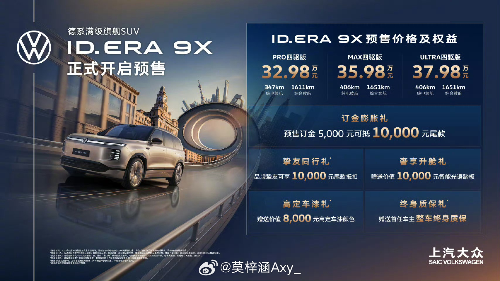 32.98万元起闭眼入大众9X上汽大众ID. ERA 9X于今日正式开启预售,定位“德系满级旗舰SUV”,推出Pro、Max、Ultra三款四驱版车型,预售价32.98万元起。搭载EA211 1.5T VTG增程器,支持92号汽油,综合续航达1651km,CLTC纯电续航406km(Pro版为347km)。亏电状态下加速衰减仅0.18秒,高海拔/极寒环境稳定性突出,青藏线实测亏电油耗低至4.57L。集智能科技、高效动力与越级质感于一身,兼顾家用实用性与出行品质,配置诚意拉满,颜值与实力双在线。无论是日常通勤还是长途自驾,都能带来安心舒适的驾乘体验,堪称同价位高性价比之选。 汽场全开大v聊车