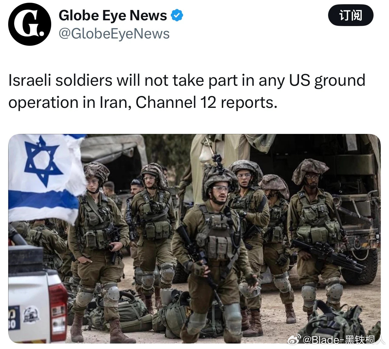 以色列士兵不会参与美国在伊朗的地面行动,知道打伊朗伤亡高