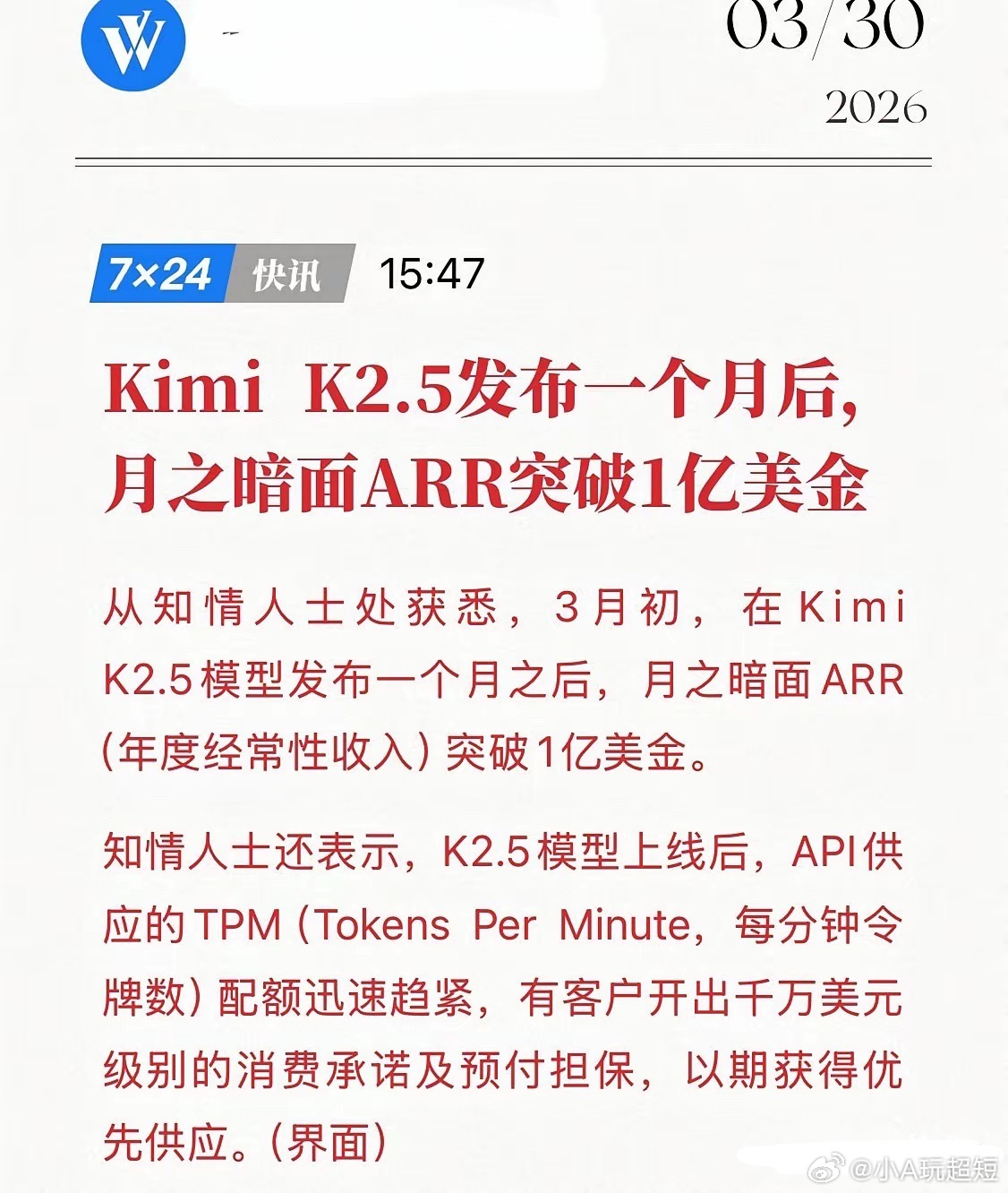 Kimi杀疯了!月入过亿美金,客户砸千万美金抢算力!3月30日,据界面新闻等权威媒体披露,月之暗面(Kimi)在K2.5模型发布仅一个月后,年度经常性收入(ARR)强势突破1亿美金!在K2.5上线后,API供应的TPM配额瞬间告急!为了拿到优先供应权,有客户直接开出千万美元级别的消费承诺和预付担保。这哪是买服务?分明是在“抢”AI时代的入场券。K2.5不是简单的模型升级,而是“智能体集群”的进化——能同时调度100个AI分身,并行处理1500个步骤。以前需要几天完成的复杂任务,现在十几分钟搞定。从写代码、做PPT到跨语言翻译,Kimi正在从聊天工具变成生产力引擎。月之暗面海外收入占比已超50%,API调用量跻身全球前五。在Hugging Face、OpenRouter等国际平台,Kimi的下载量和调用量持续霸榜,连硅谷投资人都公开推荐。中国大模型,终于在全球市场站稳脚跟!资本正用脚投票,月之暗面最新估值达180亿美元,3个月内翻了4倍。阿里、腾讯持续加码,赴港IPO传闻甚嚣尘上。当智谱、MiniMax已在港股市值破3000亿港元,月之暗面的上市,也许只是时间问题。Kimi的爆发,标志着国产大模型正式进入商业兑现时代。技术强、变现快、全球化——月之暗面,正在改写AI行业的竞争规则。