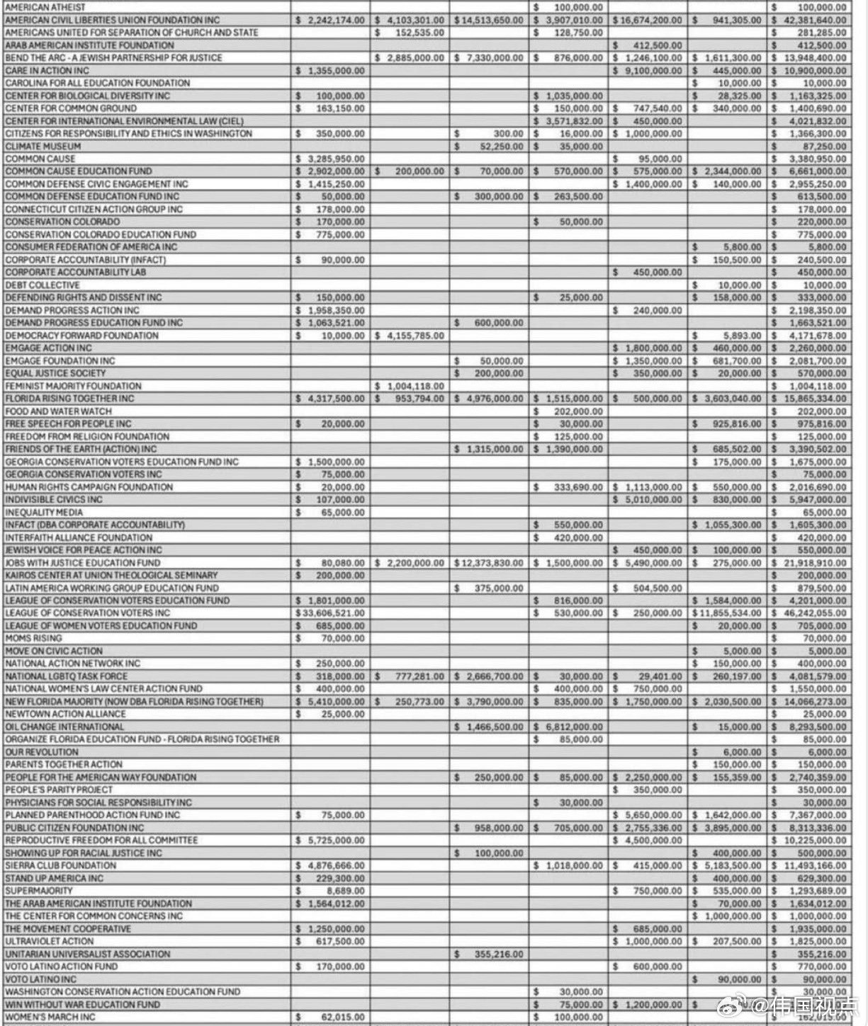 主要资助者:Arabella:7900万美元 沃伦·巴菲特:1600万美元 福特基金会:5100万美元 洛克菲勒:2600万美元 索罗斯:7200万美元 Tides:4500万美元