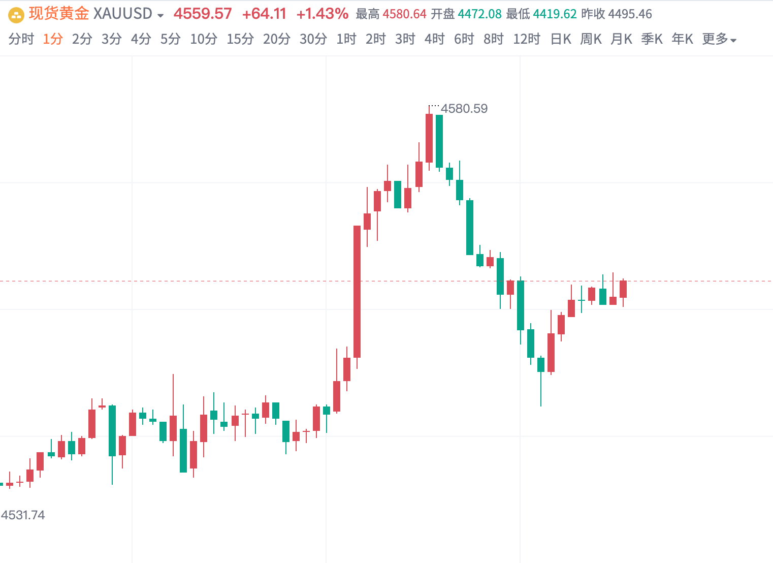 黄金4545多,抵达4560平仓,拿下150点!金价冲高4580回落,抵达454