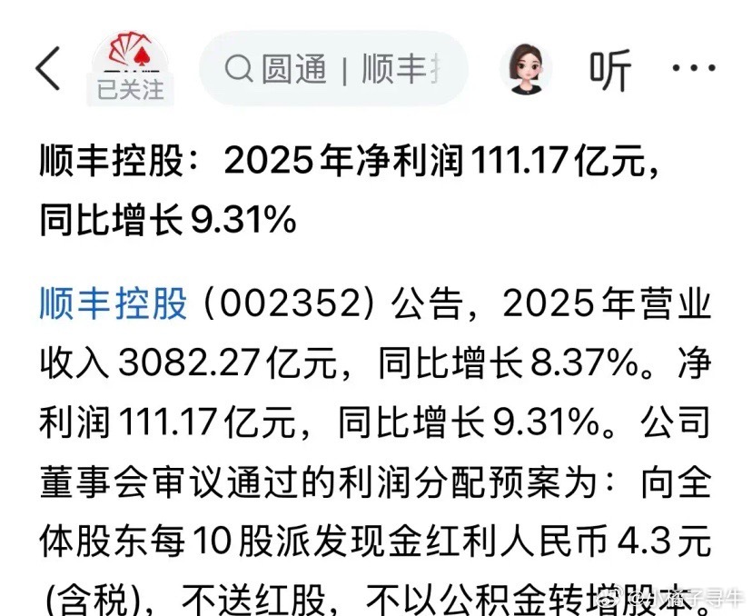 顺丰控股2025年净利润111亿元,同比增长9.3%,业绩符合预期,净利增速略超营收增速。拟每股派发0.43元,加上中期分红0.46元,2025年度分红已达每股0.89元。