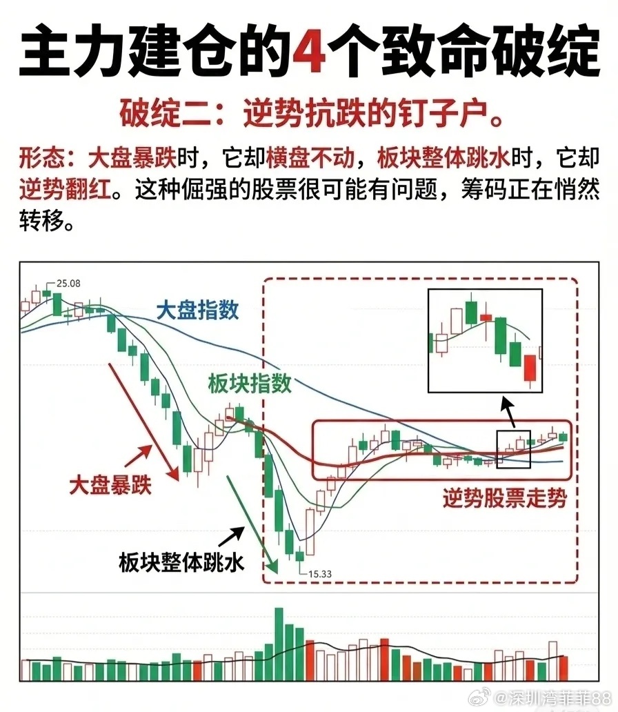 关键特征:通过对比大盘指数、板块指数与个股K线走势,可清晰识别“逆势抗跌”的形态。当市场普跌而个股独立走强时,需警惕主力借机吸筹的可能。
