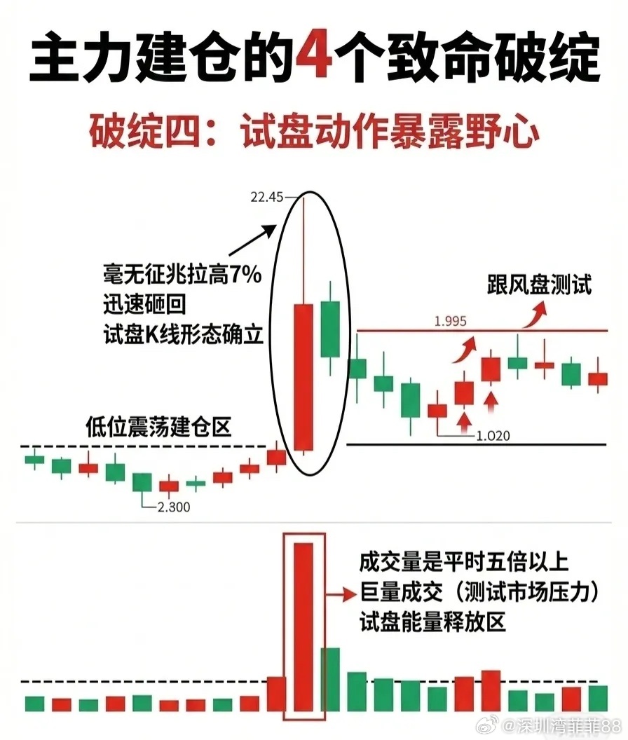 形态:股价在低位震荡建仓后,突然毫无征兆拉高约7%,随后迅速砸回——这种“试盘K线”形态确立时,成交量会放大至平时的五倍以上(巨量成交),属于主力测试市场压力、释放试盘能量的行为。