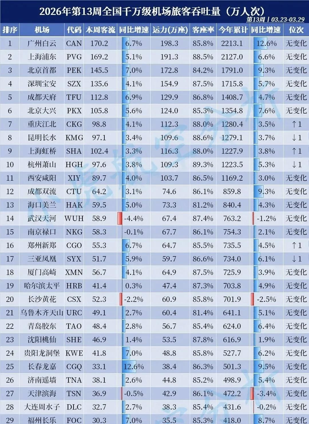 2026年第13周(3月23日至3月29日)全国千万级机场旅客吞吐量排名出炉,恰