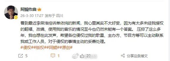 好多音乐人出来喊话版权意识了。。其实我觉得李荣浩的目的也是这个吧,杀鸡儆猴来的,