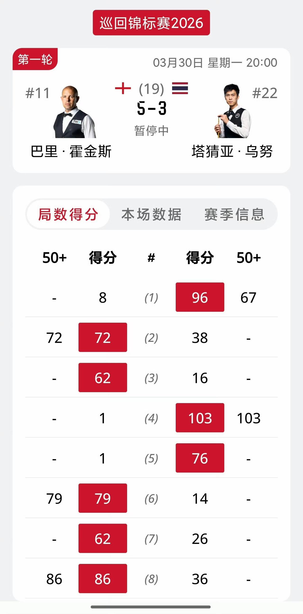 2026斯诺克巡回锦标赛12进8首阶段,局势反转太快,结局很意外。特鲁姆普0-4落后,休息回来连胜四局扳平。 泰国一哥抢了肖国栋的巡回锦标赛名额,我们内心真不希望他再赢下去。幸好霍金斯的状态很好,休息回来后连胜三局反超塔猜亚。 特鲁姆普4-4艾伦 霍金斯5-3塔猜亚