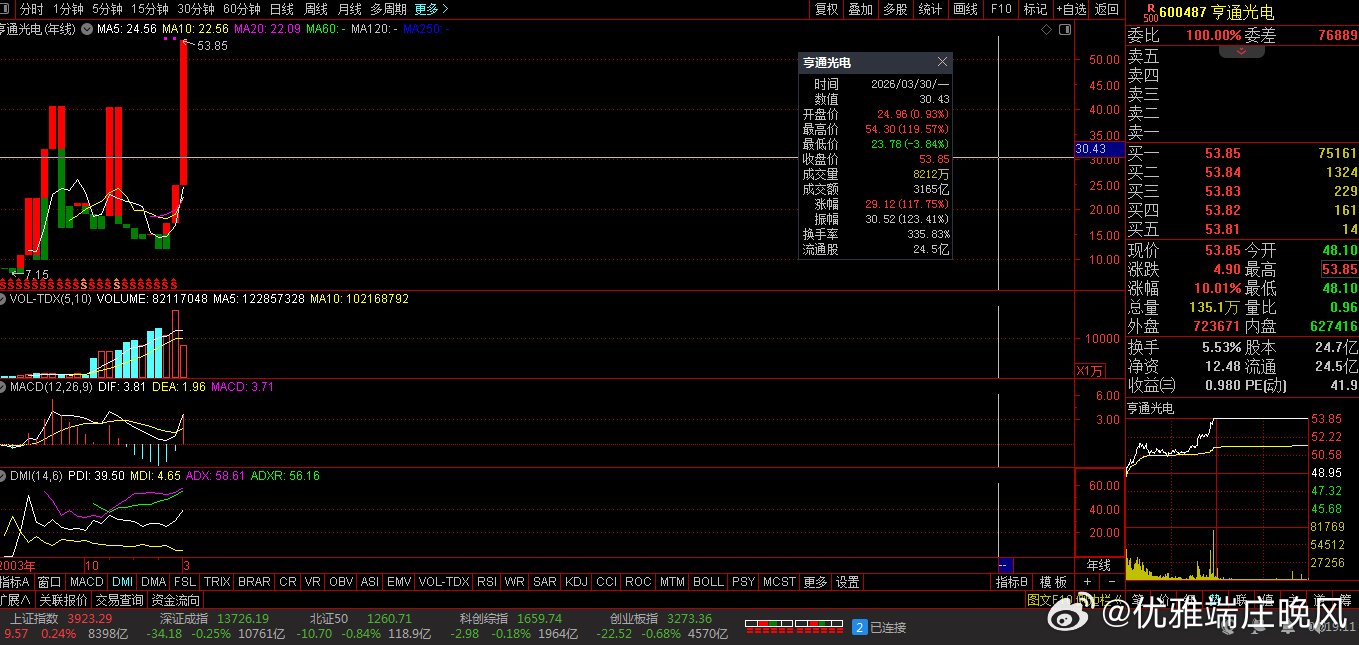 收盘价:53.85元。涨跌幅:10.01%。净流入: 9.36亿
