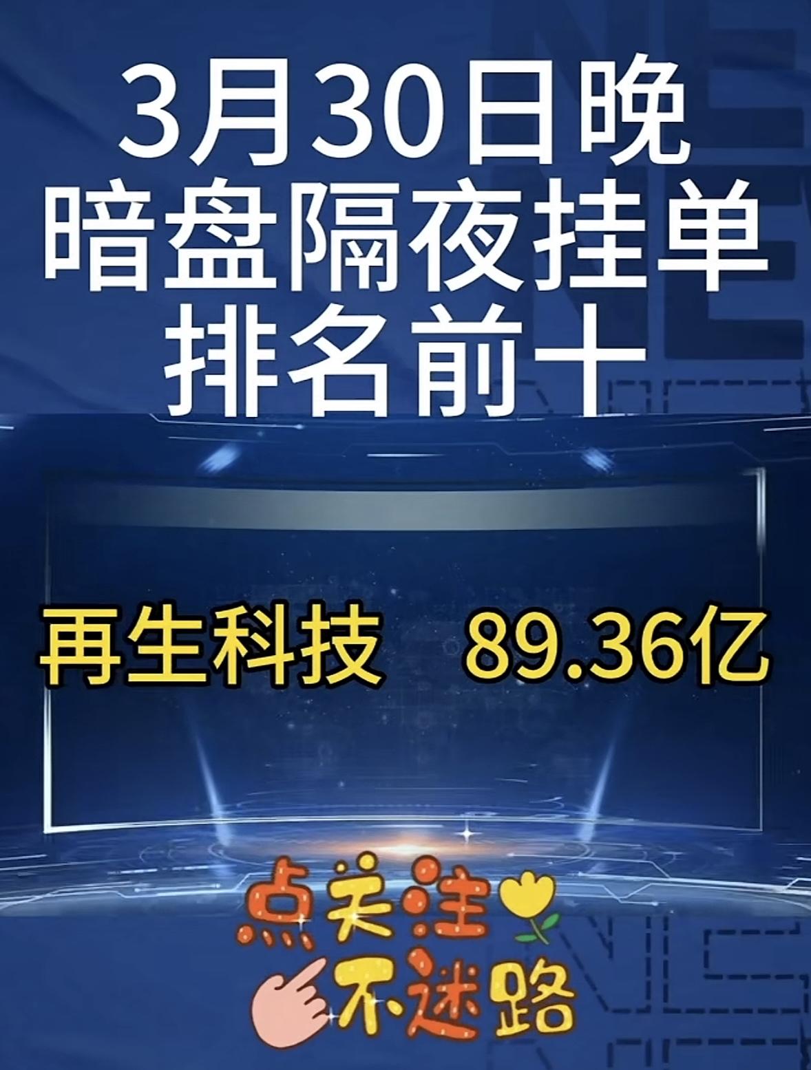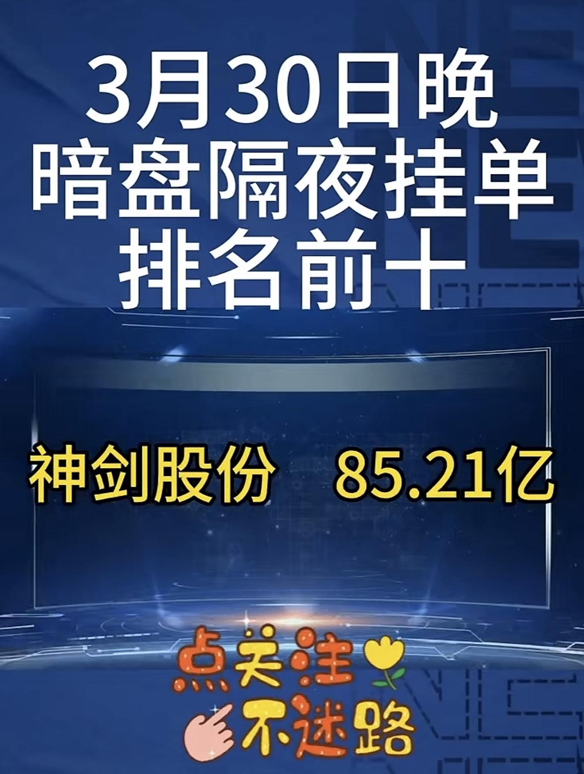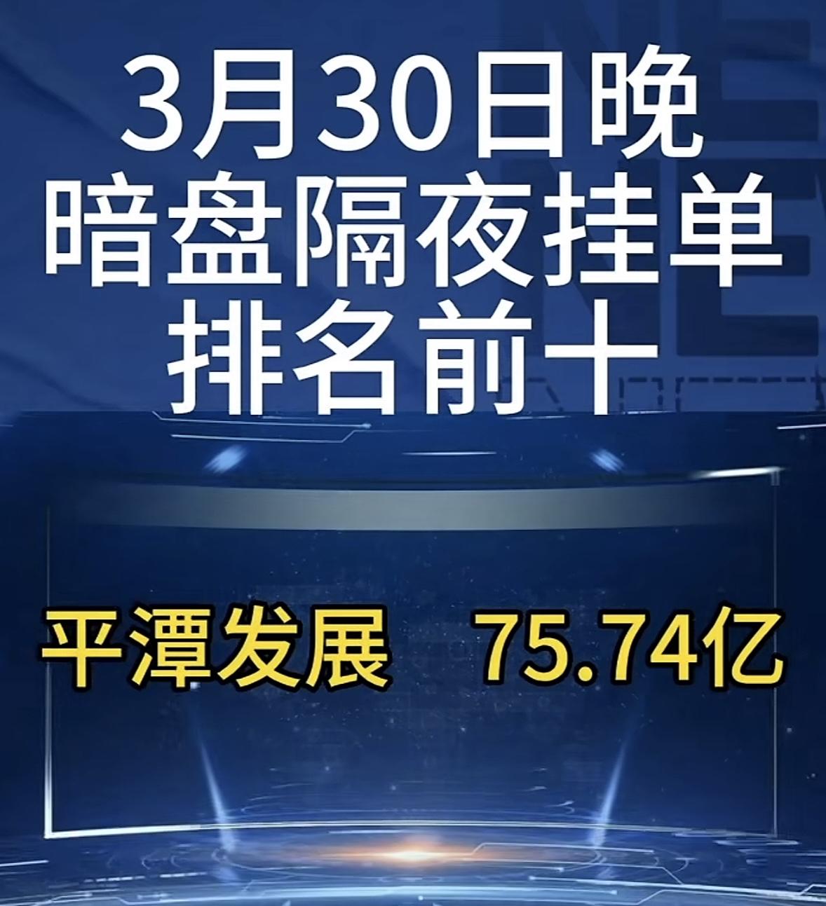 3月31日周二暗盘隔夜挂单排行榜出炉 3月30日晚平潭发展暗盘隔夜挂单排名前十,挂单75.74亿领跑,这数据太猛了!当日它就涨停了,全天换手率22.49%,成交额49亿。龙虎榜显示,深股通净买入159万,营业部席位合计净买入7.35亿。上榜的前五大买卖营业部合计成交13.72亿,净买入7.37亿。近半年它累计上榜龙虎榜29次,上榜次日股价平均涨1.81%,后5日平均涨10.39%。当日主力资金净流入19.54亿,近5日主力资金也净流入15.8亿。这架势,后续走势值得关注啊!