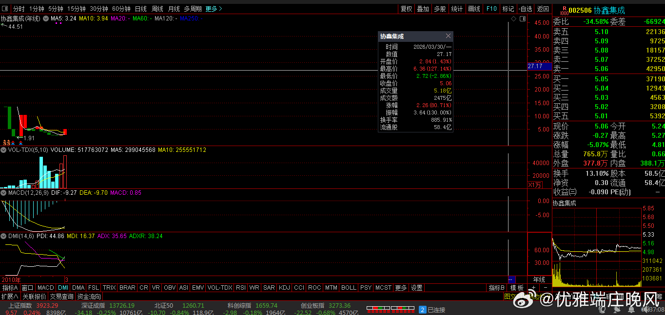 收盘价:5.06元。涨跌幅:-5.07%。净流入: -5.08亿