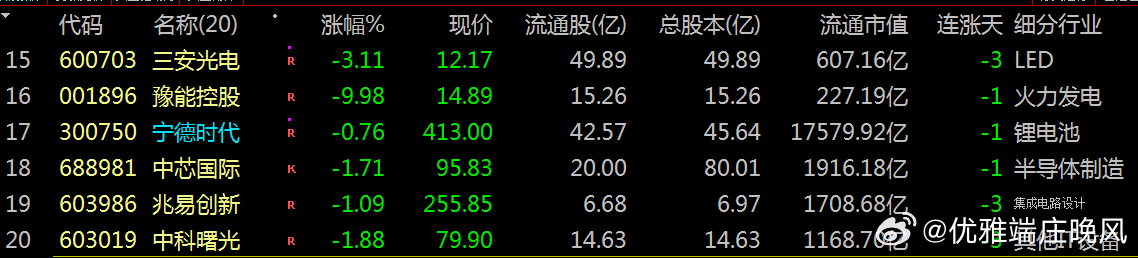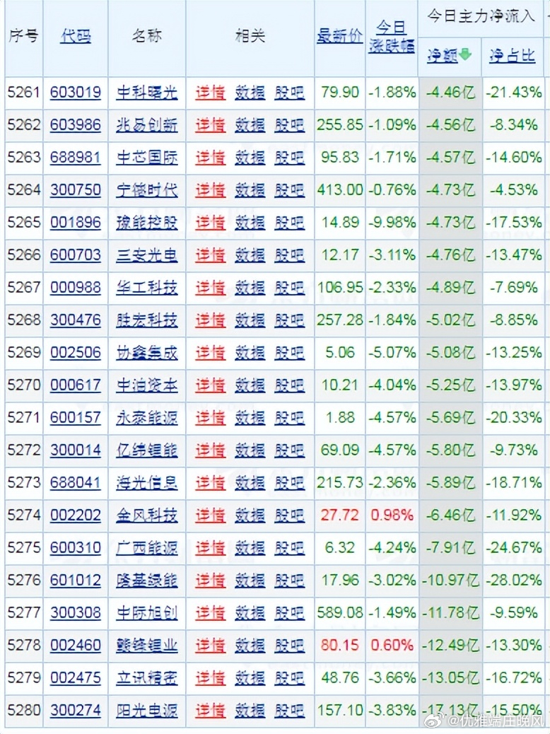 视野盘面:整体呈现:个股普涨。意料之外:阳光电源、立讯精密、赣锋锂业、中际旭创等龙头股主力资金净流出超11亿元。主要受到:新能源赛道获利了结及市场风格切换影响。当日盘面:贵金属、建筑材料等行业走强。或与避险:情绪升温及基建稳增长预期强化有关。今日透视:主力资金:流出幅度较大龙头股票: